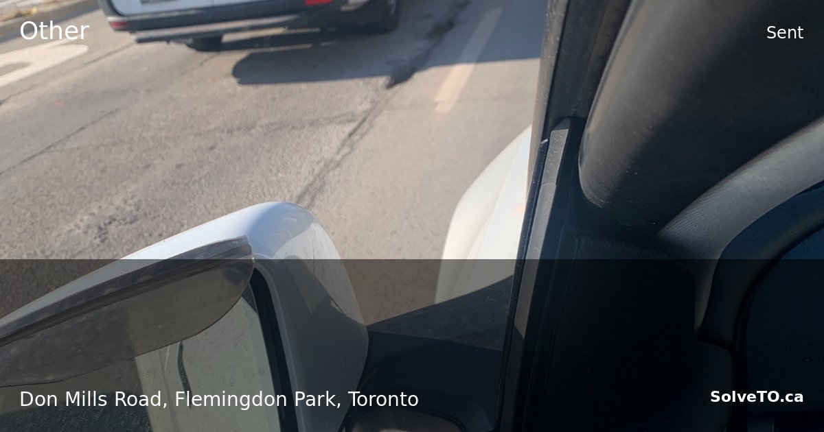 A white commercial van is parked in traffic on Don Mills Road. The van is stationary with hazard lights off; no visible damage or obstruction is apparent from the photo angle.
