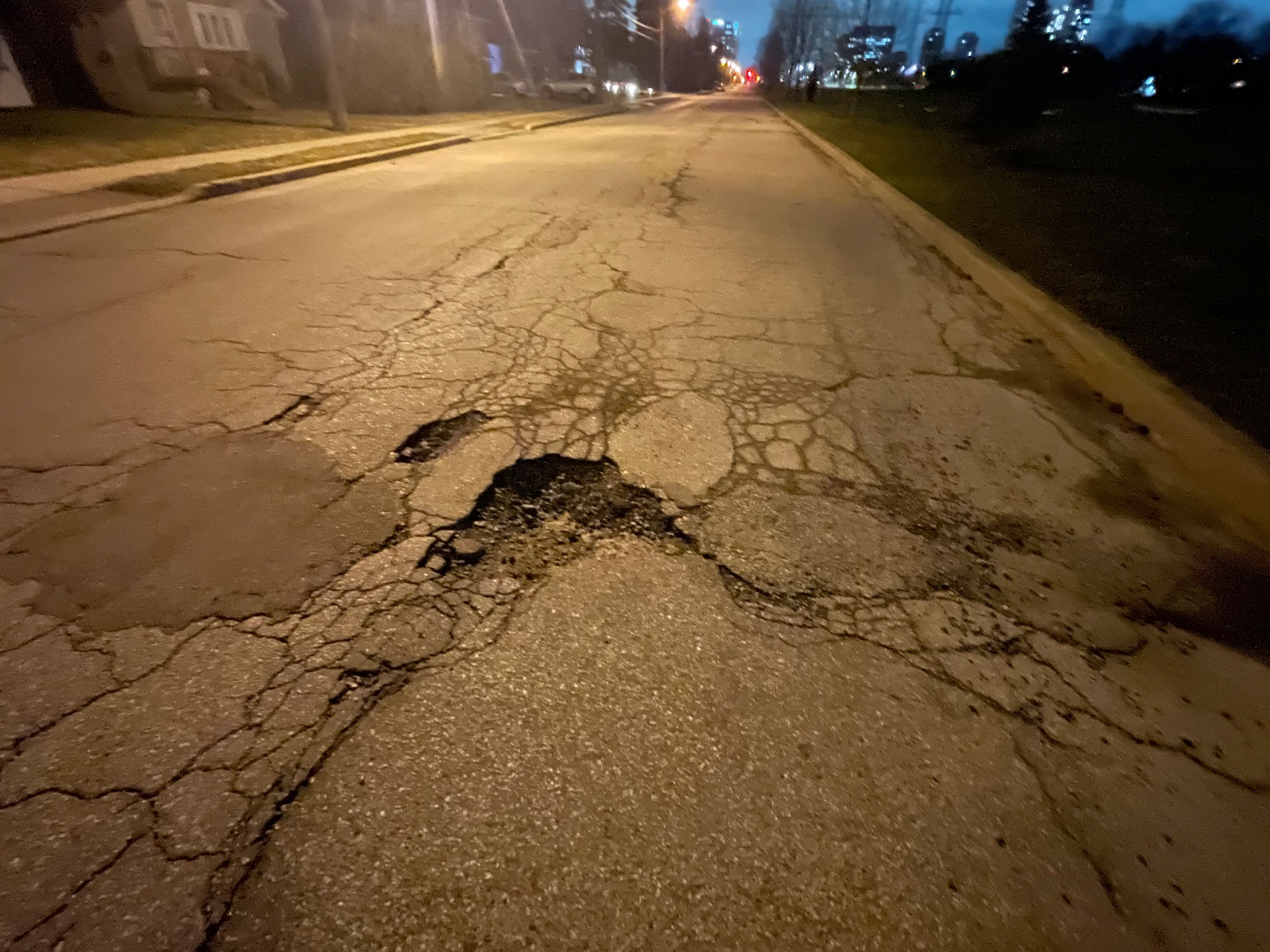 Multiple significant potholes and extensive alligator cracking cover the road surface at 185 Bishop Avenue, with one prominent hole dominating the center and severe deterioration around it. The radiating cracks and crumbling asphalt suggest structural subsidence, possible water infiltration, or utility-related damage, posing hazards to vehicles and cyclists. Urgent repair is needed.
