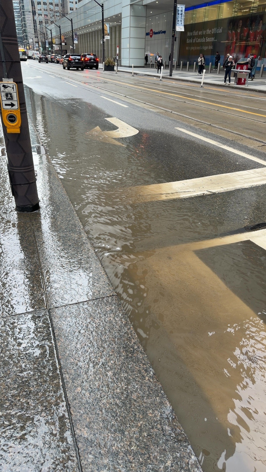 Standing water 6-12 inches deep covers the sidewalk and street at Bay and King, forcing pedestrians to navigate around the accumulation. The murky, brown-tinted water suggests blocked catch basin(s) or storm drain failure, creating a hazard for pedestrians and vehicles.