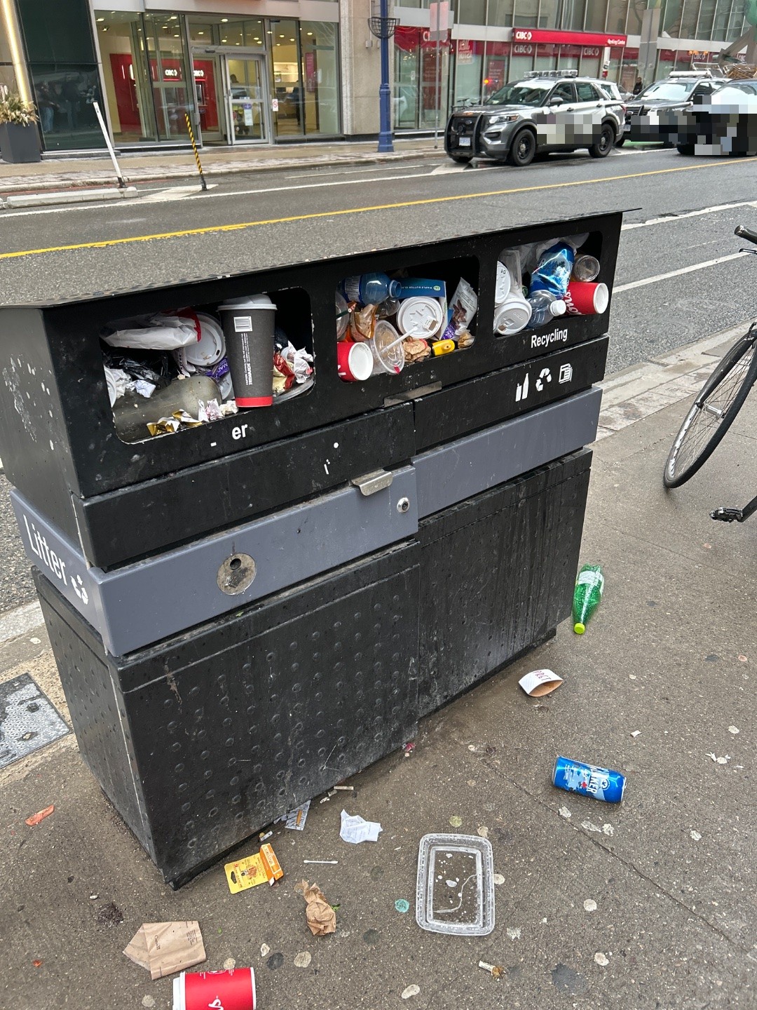 A public litter bin at 1 Bloor Street East is severely overflowing with mixed waste including plastic bottles, cans, food containers, and miscellaneous debris, with trash spilling onto the sidewalk and street. Garbage has accumulated both inside and around the base of the bin, with multiple items scattered on the pavement, indicating the bin has not been emptied in a considerable time.