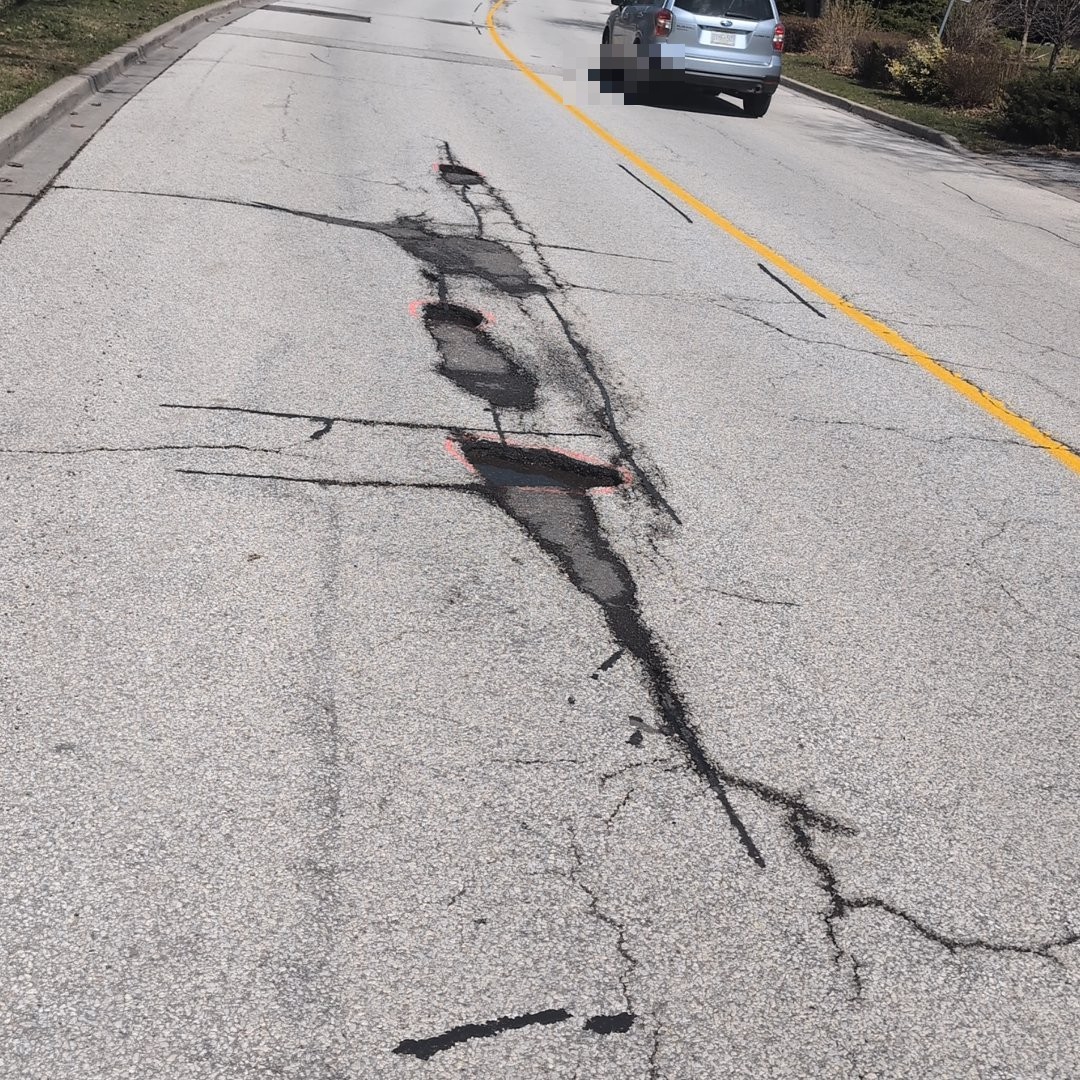A major diagonal crack with asphalt displacement approximately 15–20 meters in length crosses the road at 101 Lloyd Manor Road, with the pavement sunken on one side and marked by city inspectors. Multiple sections show dark damaged asphalt, and the proximity to catch basins and sewer manholes suggests potential ground settlement from underground water or sewer infrastructure failure. This creates a vehicle hazard and pedestrian tripping risk, with concern for a developing watermain break or sewer line failure.