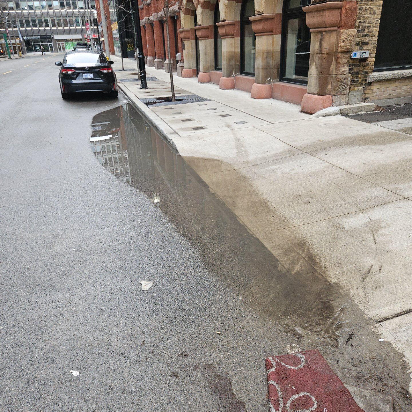 Standing water is pooling on the street in front of 36 Lombard Street, extending approximately 8-10 feet from the curb line, creating a splash and slipping hazard for pedestrians and vehicles. The pooling appears caused by inadequate drainage or a blocked catch basin. Five catch basins are located within 100 meters of the site, with an average installation date of 1923.