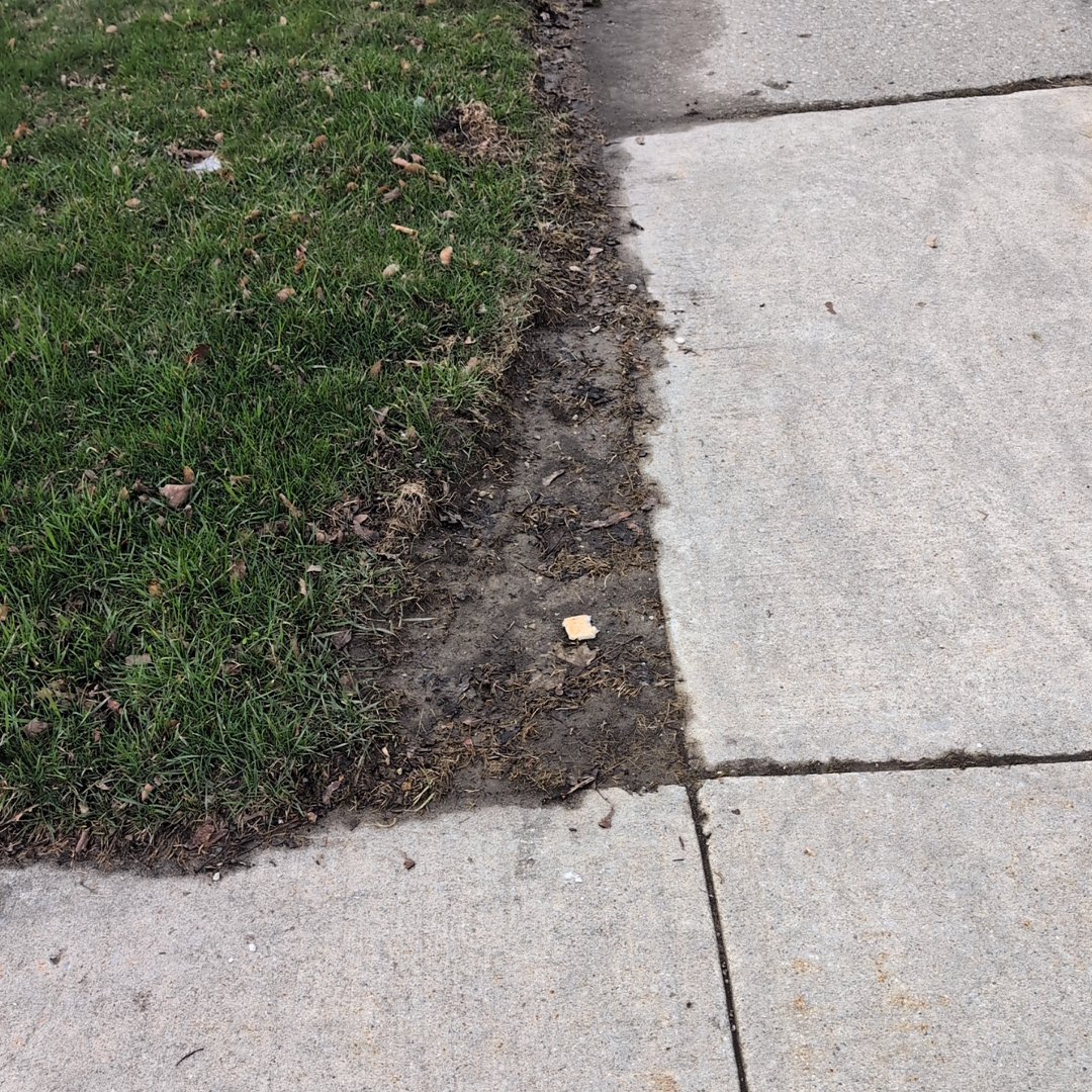 Water is pooling and running along the grass-to-pavement edge of the sidewalk at 74 Lavington Drive rather than draining properly, causing soil erosion, mud and debris accumulation, and saturation against the concrete. The nearby catch basins, averaging 70 years old, appear to be blocked or inadequate. The pooling water creates a slippery hazard and indicates drainage system failure in this area.