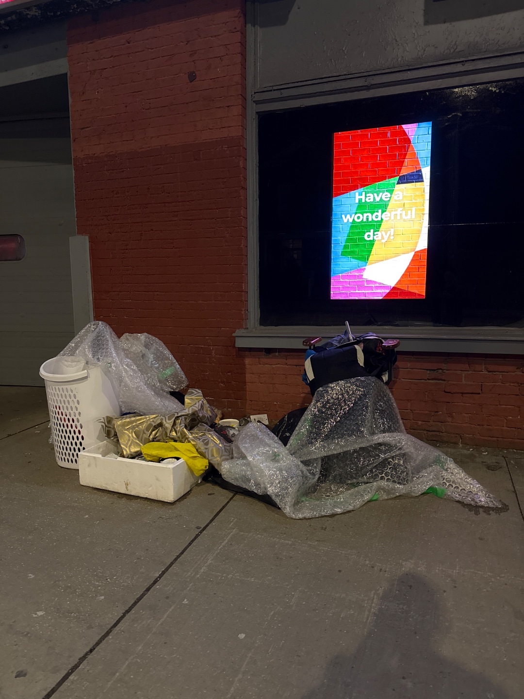 Household items and garbage bags including a white laundry basket, clear and black plastic bags, a black backpack, and a white plastic crate are abandoned across the sidewalk in front of a storefront at 1244 Dundas Street West, creating a pedestrian obstruction. The deliberate placement of items suggests illegal dumping rather than accidental litter. Despite three nearby litter bins serviced seven times weekly, the accumulation remains on the public walkway.