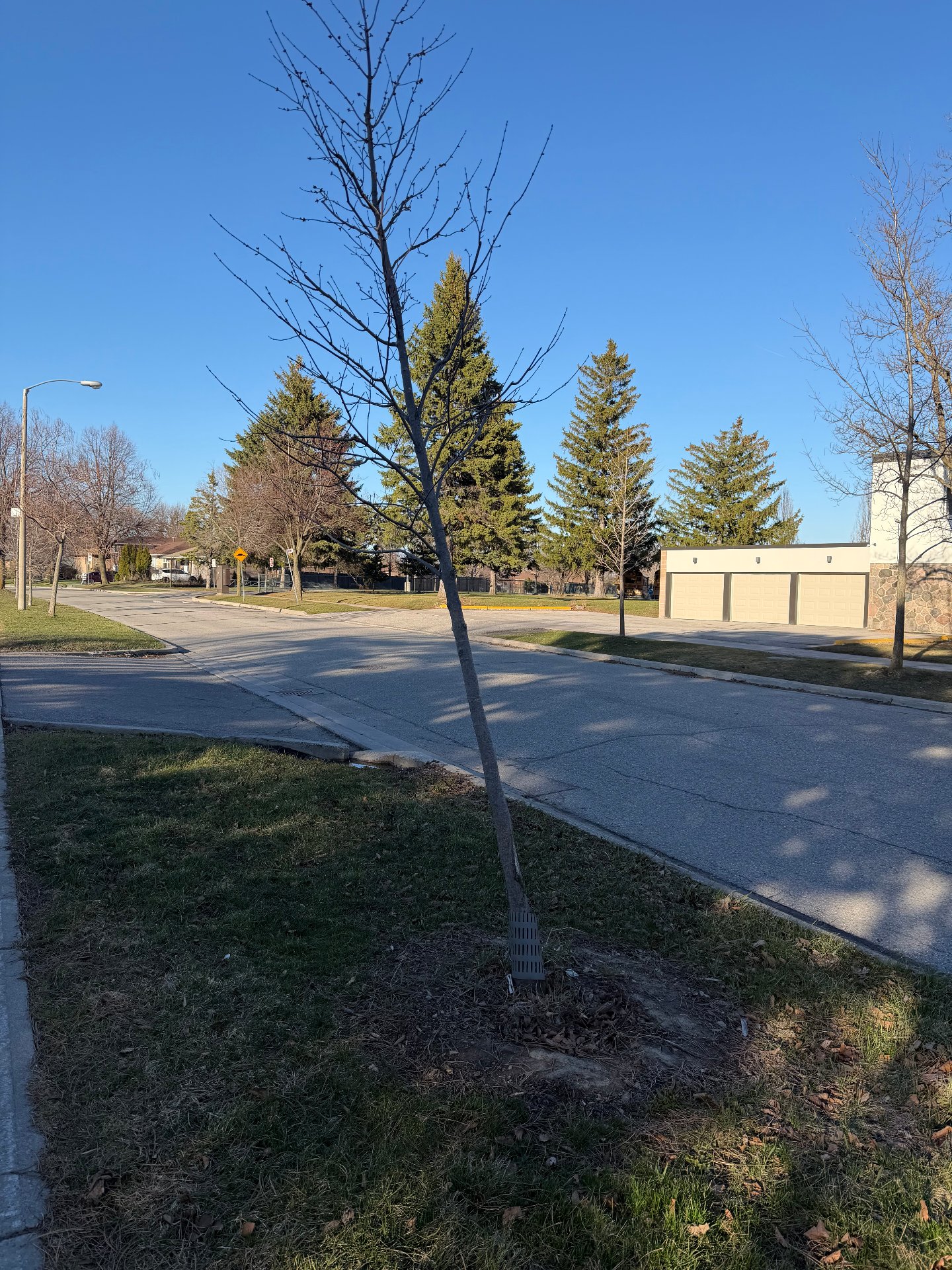 A young city-planted tree at 9 Dormington Drive has a main trunk bent at approximately 30-40 degrees from vertical, likely struck by a snowplow. The structural damage prevents the tree from self-correcting, and it requires immediate bracing to restore vertical position or full replacement to prevent further weakening, death, or potential hazard if the trunk snaps.