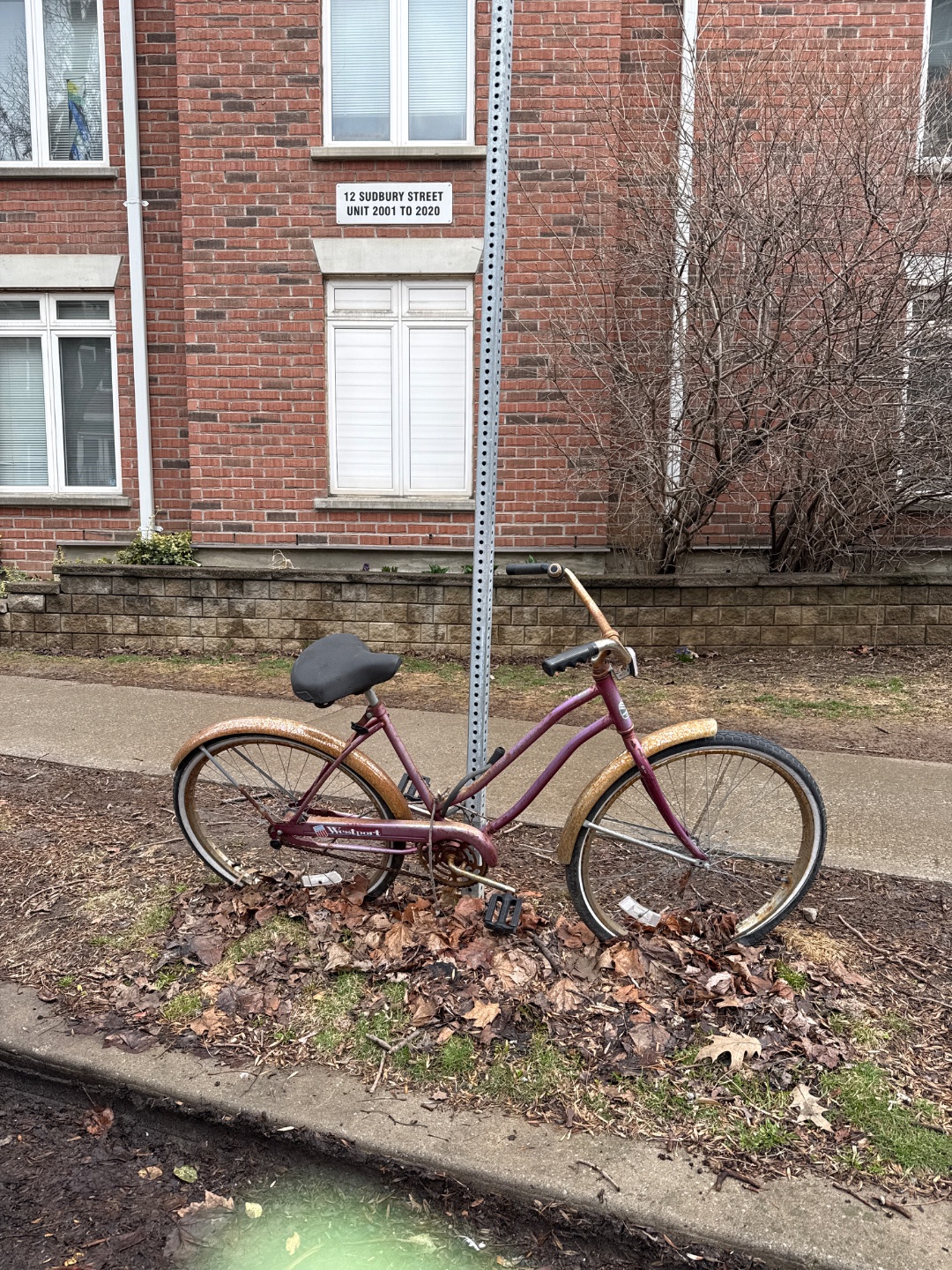 One abandoned bicycle with a purple/maroon frame is locked to a metal utility pole on the sidewalk at 12 Sudbury Street, showing signs of long-term neglect including rusted wheel rims, deteriorated components, and accumulated debris. The bike obstructs the pedestrian pathway and should be removed.