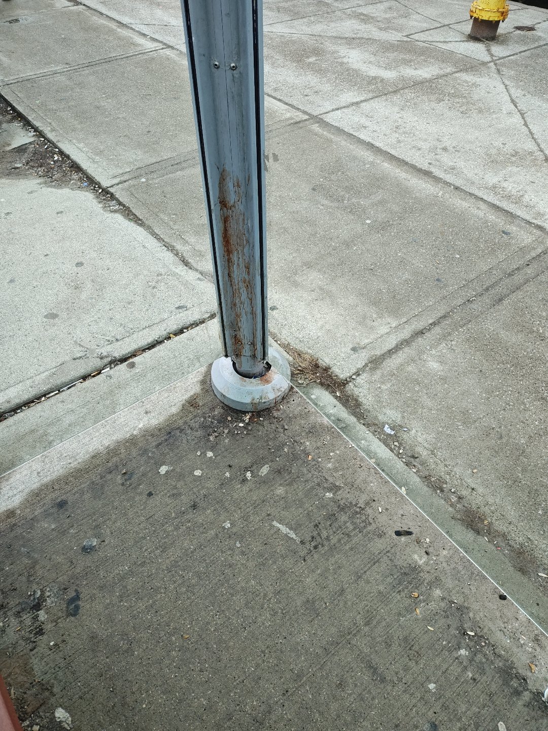 A metal utility pole supporting transit shelter #5083 on Markham Road shows significant rust deterioration and corrosion on its lower section, with visible rust staining and discoloration indicating age and lack of maintenance. The pole's white concrete mounting base is visible at ground level in this high-pedestrian transit area.
