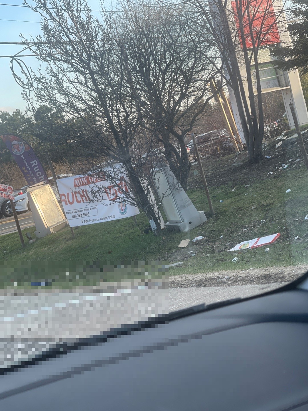 A white commercial trailer/dumpster lies overturned on its side on a grassy embankment next to a residential building on Markham Road, with debris and scattered litter including cardboard and metal scraps visible around the site. The overturned trailer appears abandoned and creates a potential hazard, with accumulated waste materials showing signs of neglect.