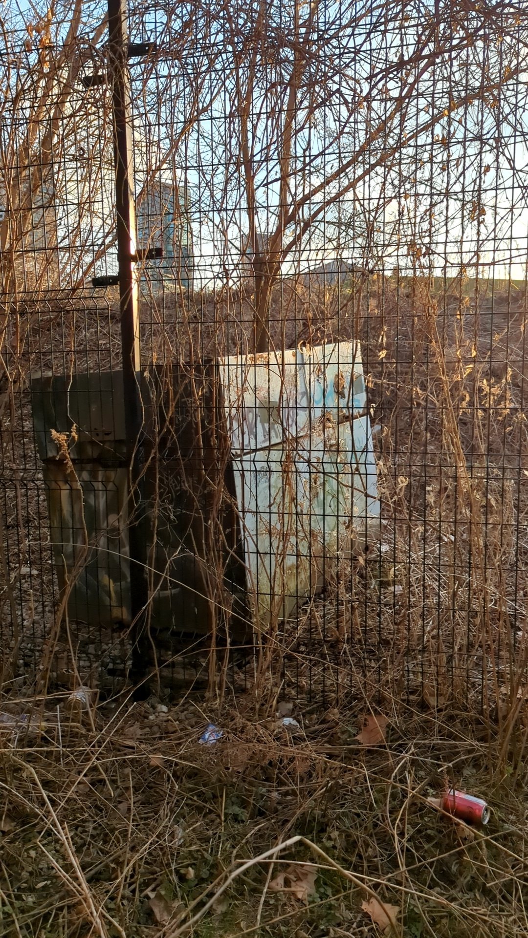 An abandoned metal dumpster with graffiti is located inside a fenced, overgrown area within the old fort heritage site at Fort York Boulevard. The bin sits among dense dead vegetation, vines, and accumulated debris, appearing to have been left unattended in this neglected space. This constitutes illegal dumping on a heritage property and requires removal and site cleanup.