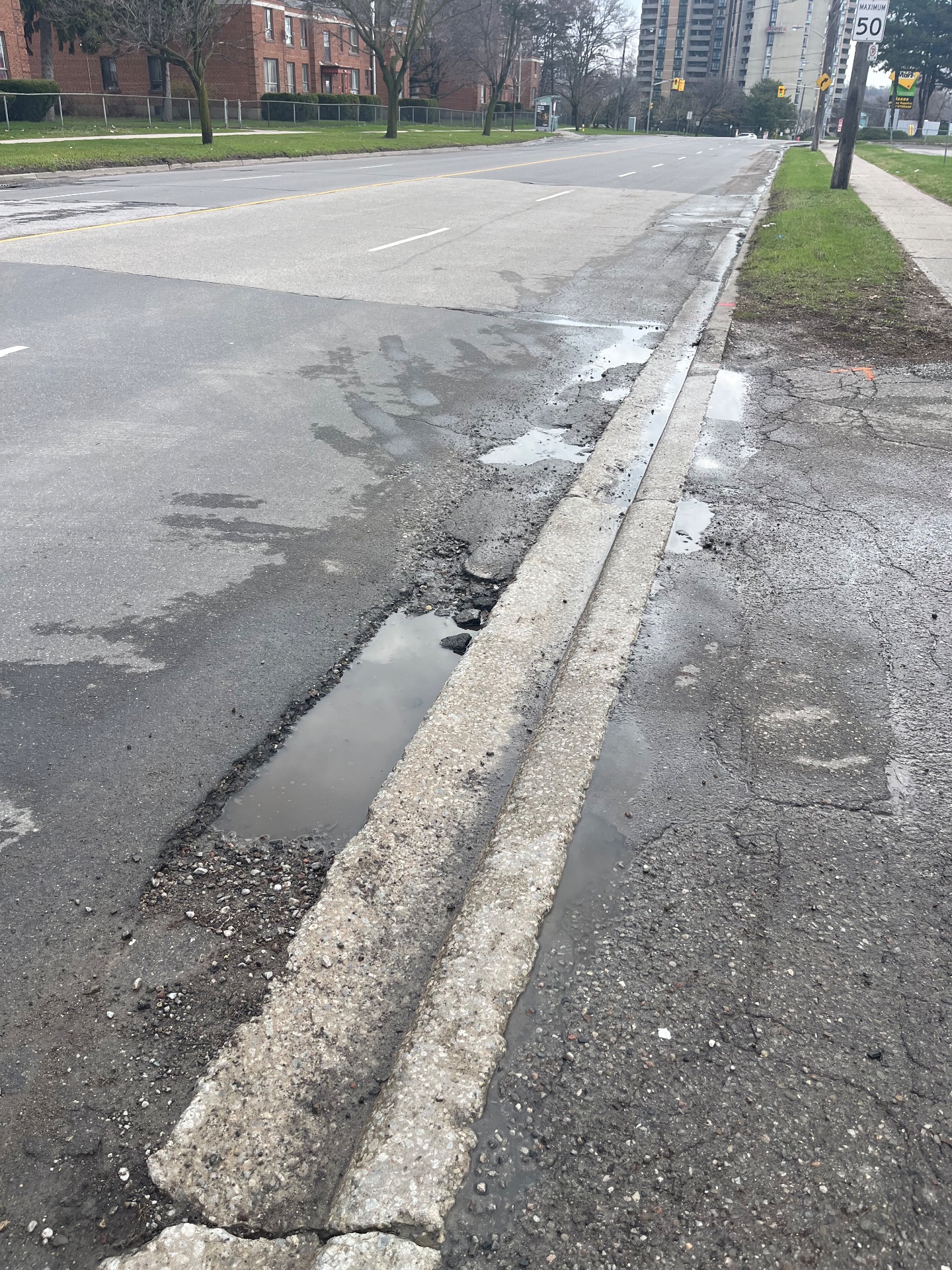 Standing water pools along the curb in a linear depression at this location, indicating a blocked or failing storm drain. The concrete curb is crumbling with exposed aggregate, and water is not draining properly, creating a pedestrian tripping hazard and potential basement flooding risk for adjacent properties. The nearby catch basin infrastructure, averaging 54 years old, is not functioning to capture this runoff.