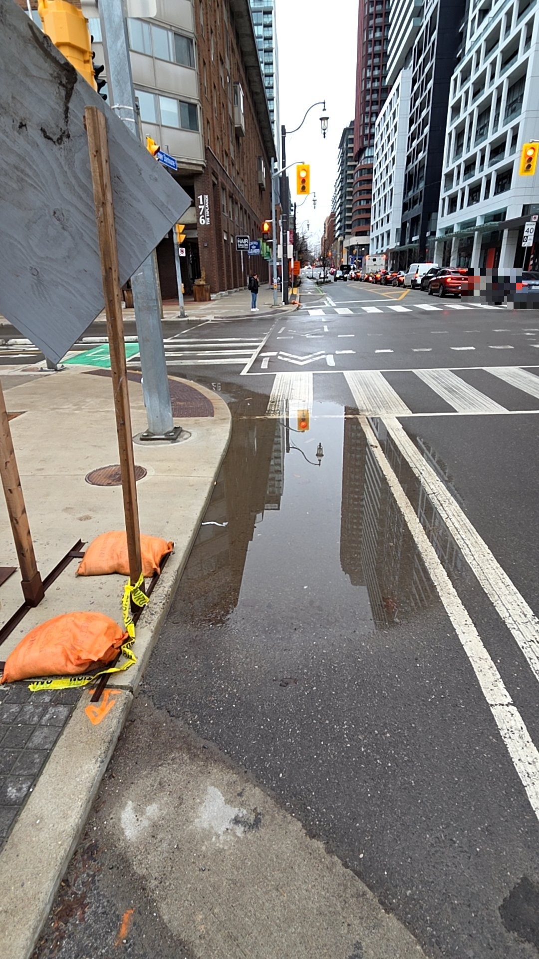 Standing water is pooling across the bike lane and into the street gutter at this Lower Sherbourne Street intersection, forcing cyclists into vehicle traffic. The nearby catch basins are not clearing the water, indicating a blocked storm drain system. Orange construction bags and caution tape on the sidewalk suggest drainage work may already be underway.