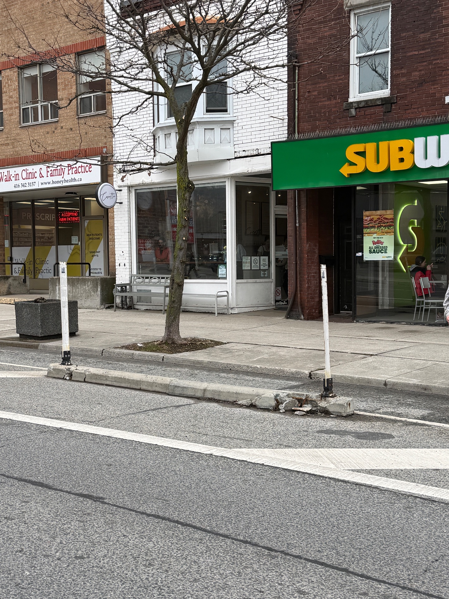The concrete curb protecting the cycle track at 1717 Bloor Street West is crumbling with chunks missing and edges breaking apart, creating a tripping hazard for cyclists and pedestrians. This deterioration compromises the barrier's function of separating the bike lane from vehicle traffic. The damage is localized along the storefront edge.