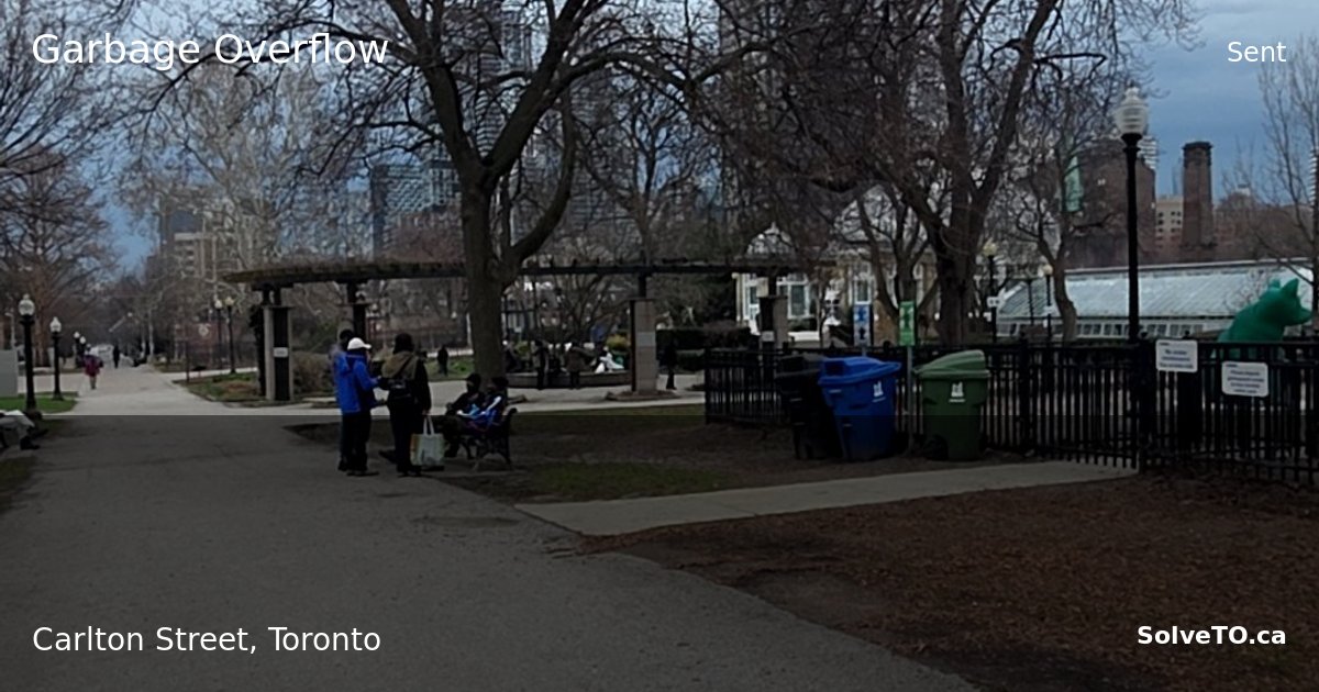 Open needles and discarded medical supplies are present near the greenhouse entrance at Carlton Street. This biohazard waste requires professional cleanup due to bloodborne pathogen exposure risk and cannot be handled by standard waste services. Three litter bins are nearby with regular collection, but specialized remediation is needed for safe removal.