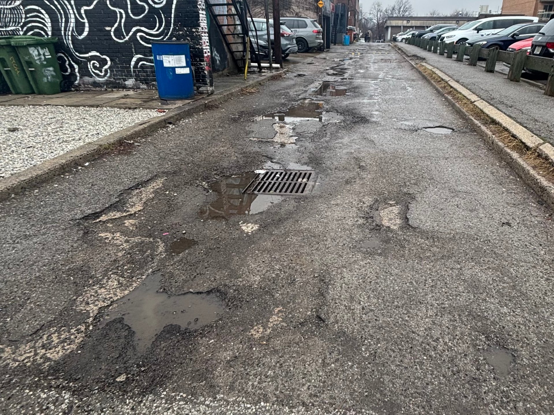 The alleyway behind Christie TTC Station (Lane North Bloor East Christie) is in very poor condition, with many large potholes and a deteriorated speed bump. The uneven surface poses a hazard to vehicles, cyclists, and pedestrians.