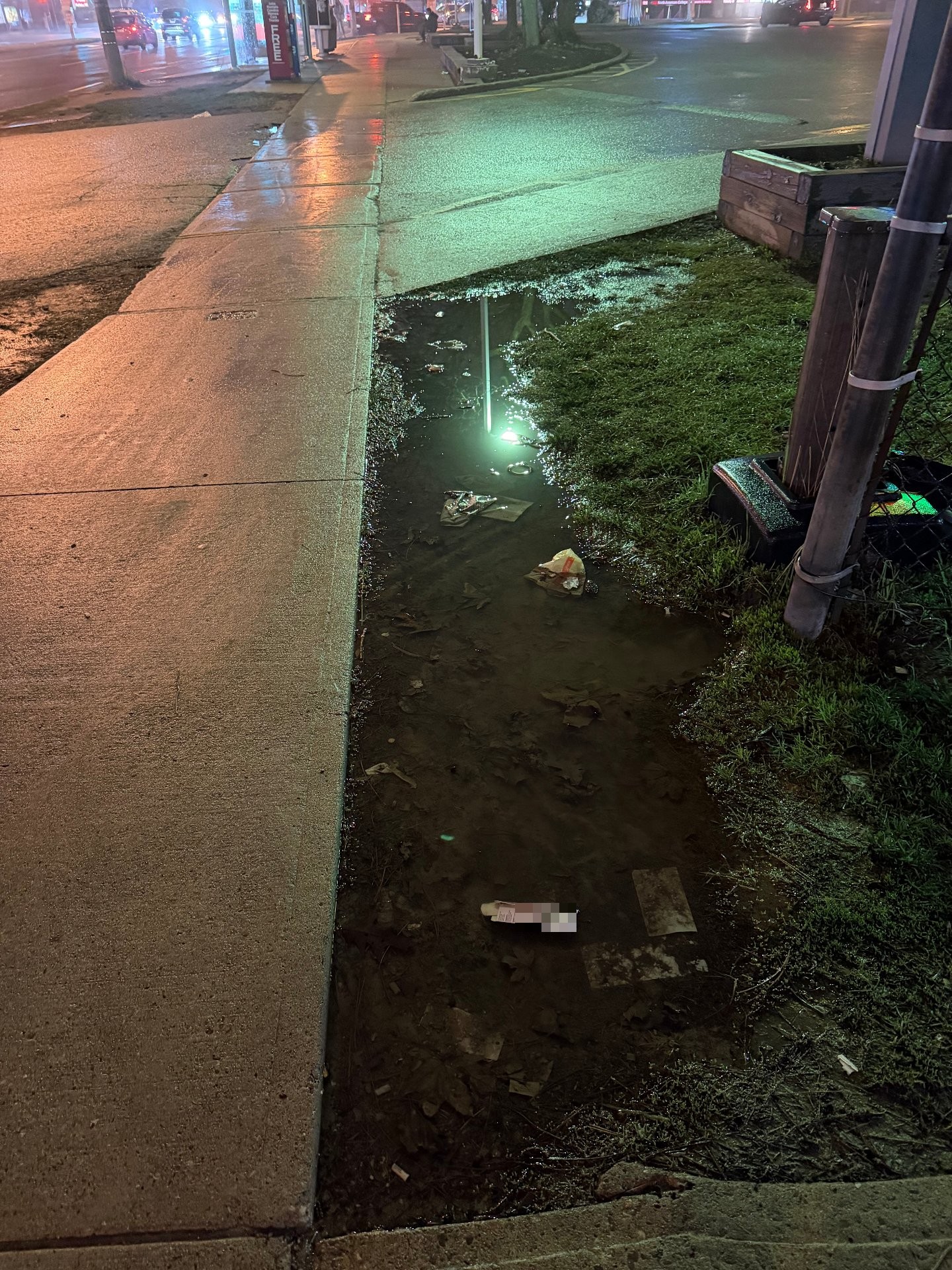 Sinkhole beside sidewalk creating a danger for pedestrians and collecting mud and debris