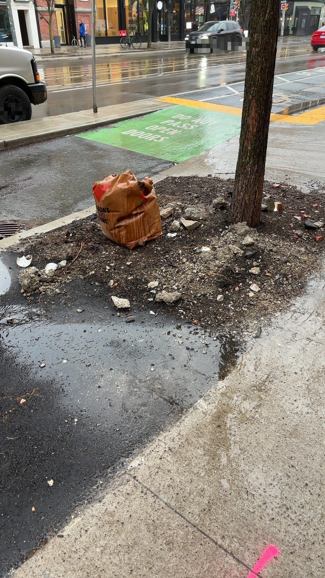 A sunken section of sidewalk around a tree pit at 518 College Street has broken and missing concrete with exposed soil, creating a depression approximately 2-3 inches below the adjacent surface. Water is pooling in the depression and loose gravel is scattered across the damaged area, creating a tripping hazard for pedestrians. A trash bag is positioned nearby, suggesting debris collection may be underway.