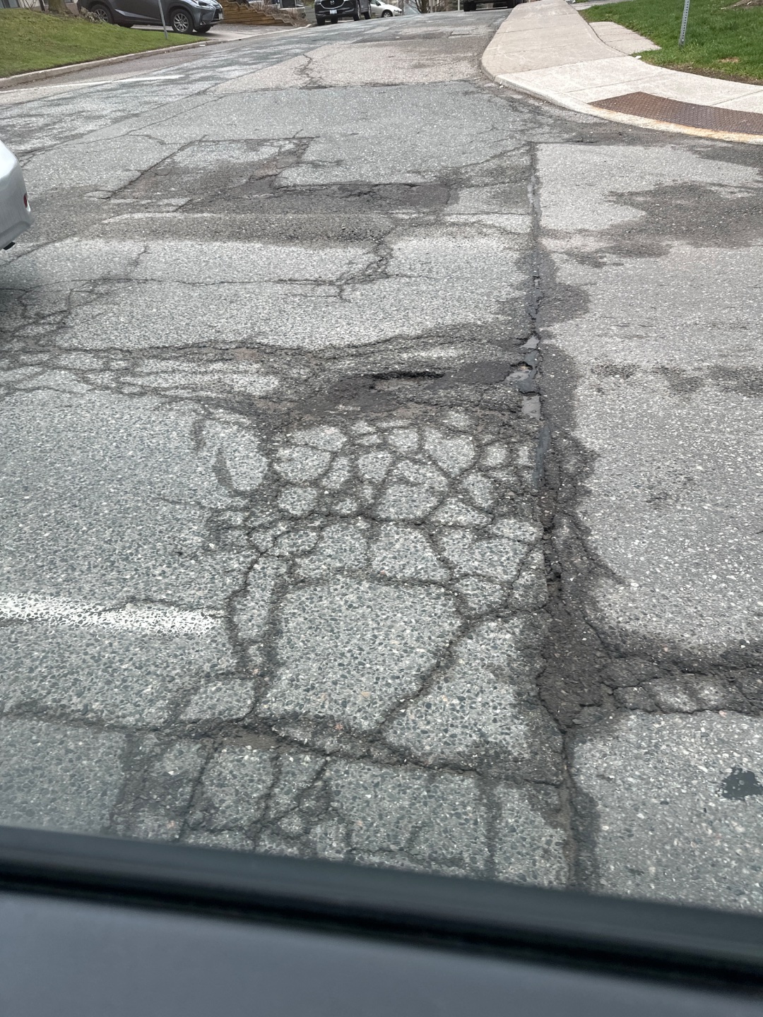 Extensive alligator cracking and asphalt deterioration spans approximately 20 meters across the center and right portions of Eglinton Avenue East, forming a honeycomb pattern that indicates subsurface failure likely from water infiltration through aging catch basins and sewer lines in the area. The damaged section creates a significant tripping and sinking hazard for vehicles and risks rapid expansion without prompt repair.