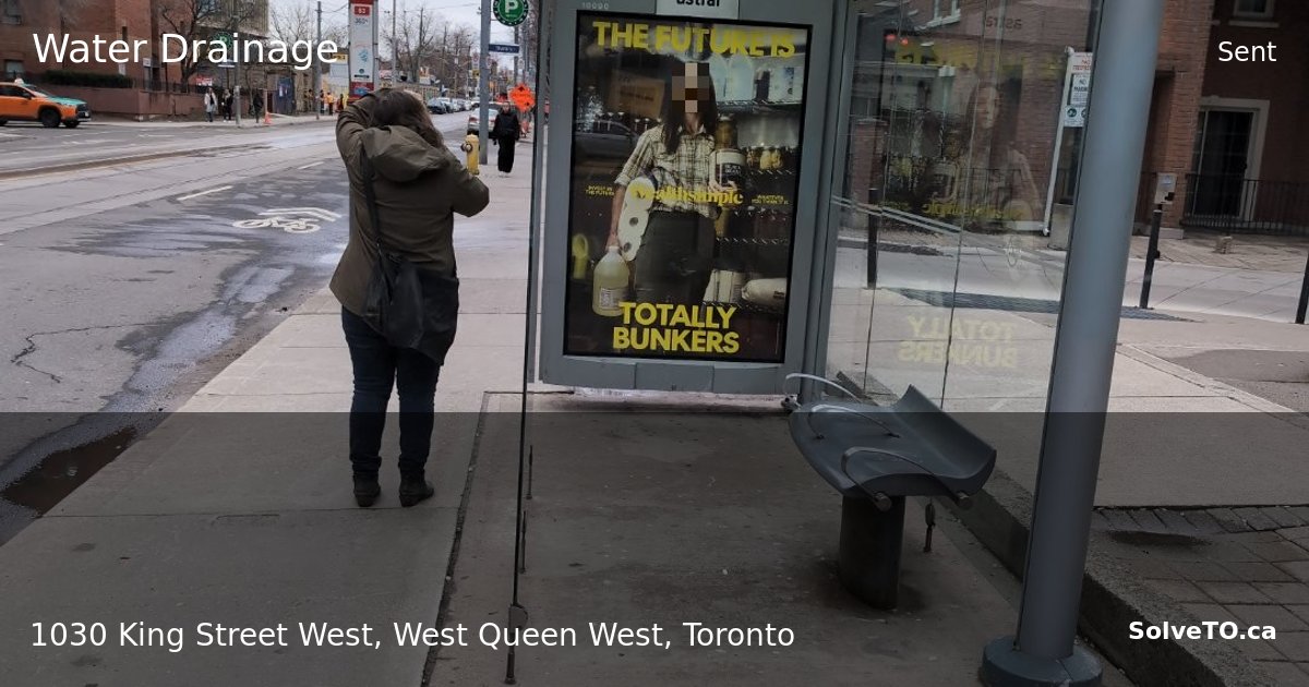 Standing water is pooling on the concrete pad in front of the TTC bus shelter at 1030 King Street West, indicating a blocked or inadequate storm drain. The accumulation creates a hazard for pedestrians accessing the bus stop, particularly for users with mobility challenges or wheelchairs. Nearby catch basins average 91 years old, suggesting potential drainage system failure in this area.