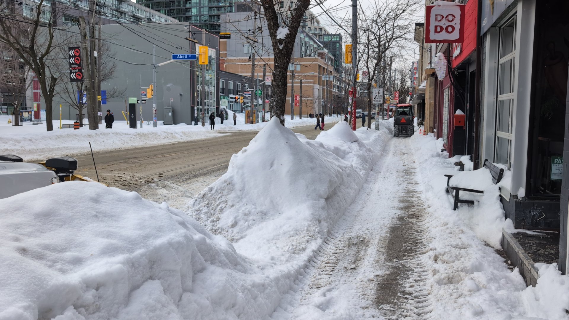 Large compacted snow windrows approximately 1-2 meters high have accumulated along the sidewalk and street edge on King Street West, creating ice hazards and blocking pedestrian access. Pedestrians are forced into the street or away from the sidewalk due to the blockage. Immediate removal is needed to restore safe pedestrian passage.