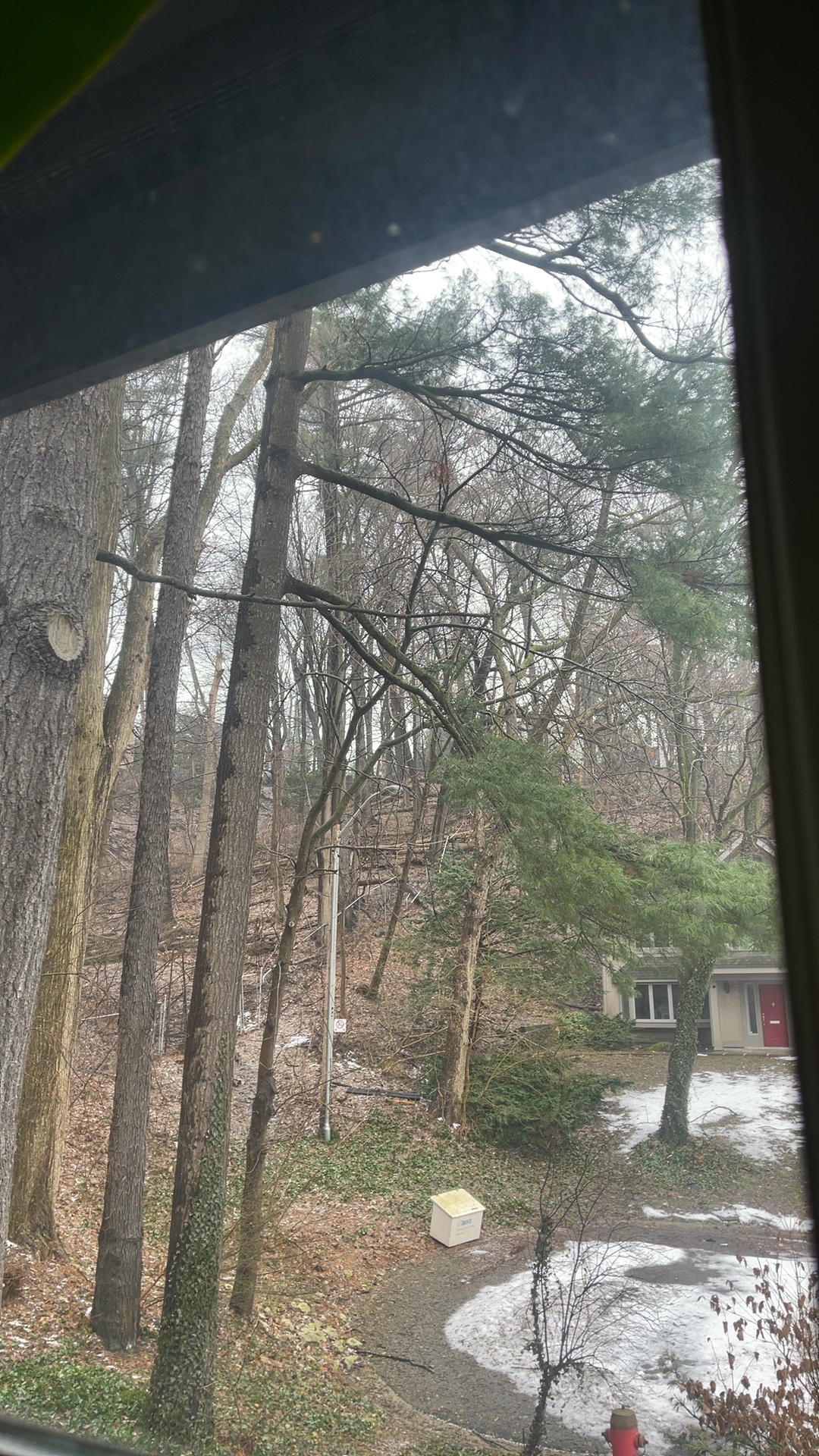 Street light outage has left the area dark for several weeks. Overgrown tree branches are hanging low across the property and may be obstructing the light or creating safety hazards for pedestrians. Dead and tangled branches should be trimmed back to restore visibility and clear any potential utility interference.