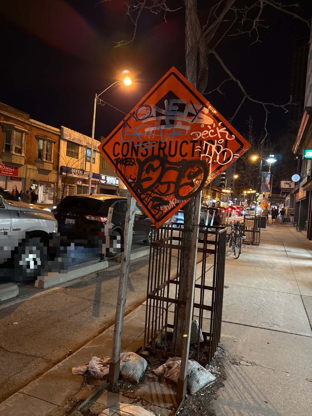 An orange diamond-shaped construction warning sign at 1175 Bloor Street West is heavily defaced with graffiti covering approximately 70% of the sign surface, obscuring the warning message and reducing its effectiveness for pedestrian and driver safety. The sign is mounted behind a protective metal railing at sidewalk level and remains structurally intact despite the spray paint tags and marker damage.