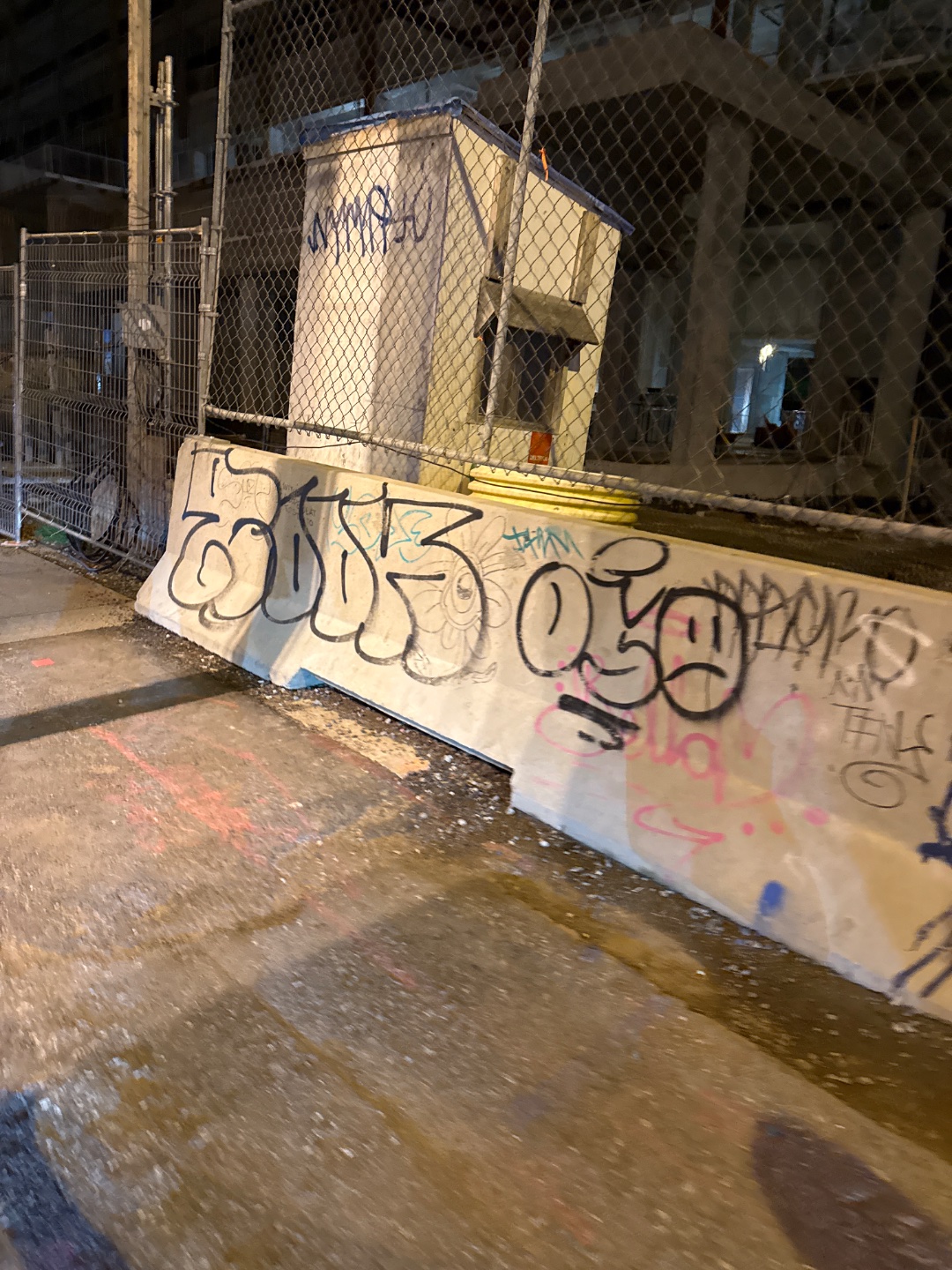 A white plywood barrier panel lies horizontally across the street at Bloor Street West and Brock Avenue, completely covered in black, blue, and pink graffiti tags. The unsecured panel blocks public access and creates a tripping hazard for pedestrians and vehicles. This appears to be abandoned construction debris rather than a permitted temporary closure.