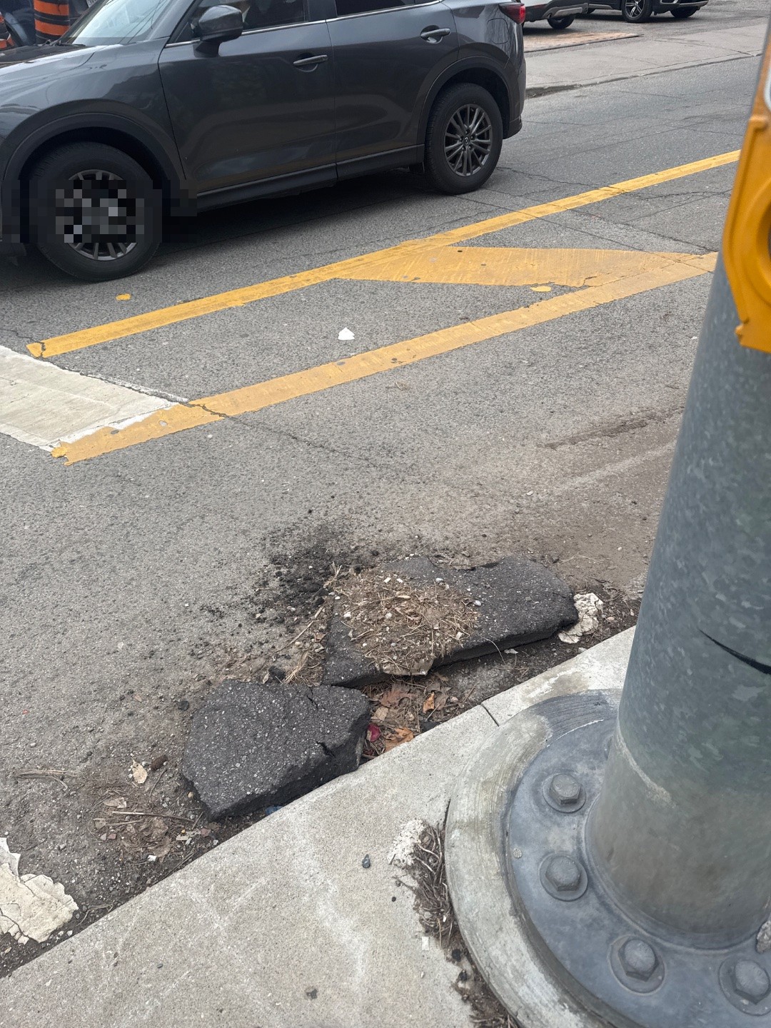 A sinkhole approximately 1.5–2 feet wide and 1–1.5 feet deep has formed near the curb and catch basin at this active intersection, filled with dark soil, debris, and standing water. The depression indicates a likely blockage or failure in the underlying storm drain system. This creates a tripping hazard for pedestrians and cyclists, and risks vehicle suspension damage or further roadway collapse.