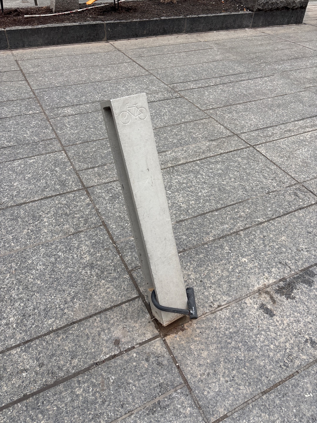 A white concrete bike rack bollard has fallen onto its side on the paved plaza at 43 Bloor Street East, remaining partially connected to its black metal mounting base. The fallen post creates a trip hazard and obstructs foot traffic, indicating structural failure of the cycling infrastructure.