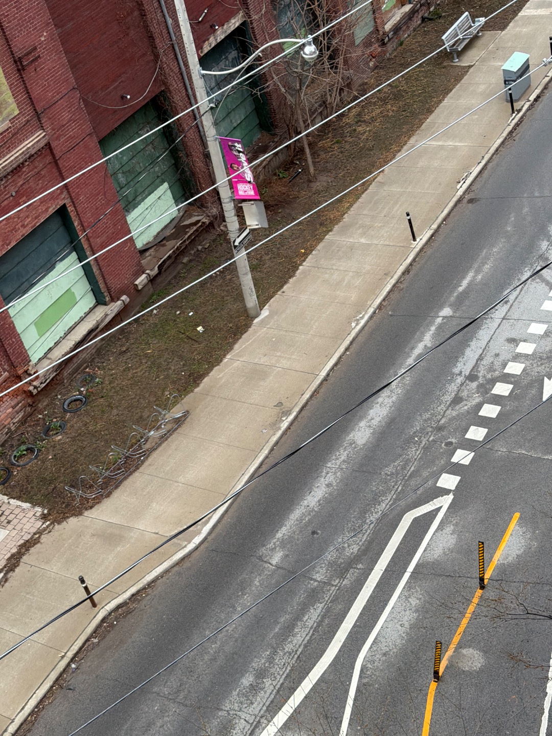The AI analysis of this image is completely wrong. There were no yellow bollards here and they are not obstructing the road. The issue here is to steel bollards are missing and have not been replaced. They are constantly ripped out by vehicles. Much stronger and larger bollards are needed here.