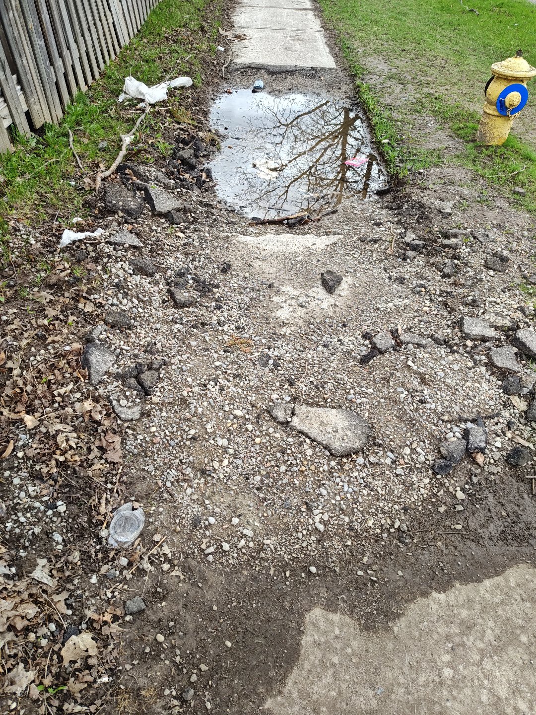 The alley surface is severely degraded with extensive broken concrete and missing asphalt that expose gravel and stone aggregate, creating tripping hazards and blocking pedestrian and vehicle movement. Standing water pools in the center of the laneway indicate blocked or inadequate storm drainage, and the nearby catch basins and sewer infrastructure suggest drainage system failure. The five catch basins in the area, averaging 48 years old, appear unable to manage current drainage demands.