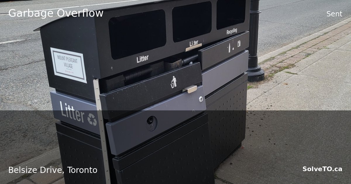 A public litter bin at the Belsize Drive intersection has visible damage to its upper compartment—the lid appears cracked and warped, which may prevent it from properly containing garbage. The bin is located on a busy commercial street with active traffic, and the damaged lid creates a maintenance hazard. The station has three bins total in the area with collection service seven times per week.