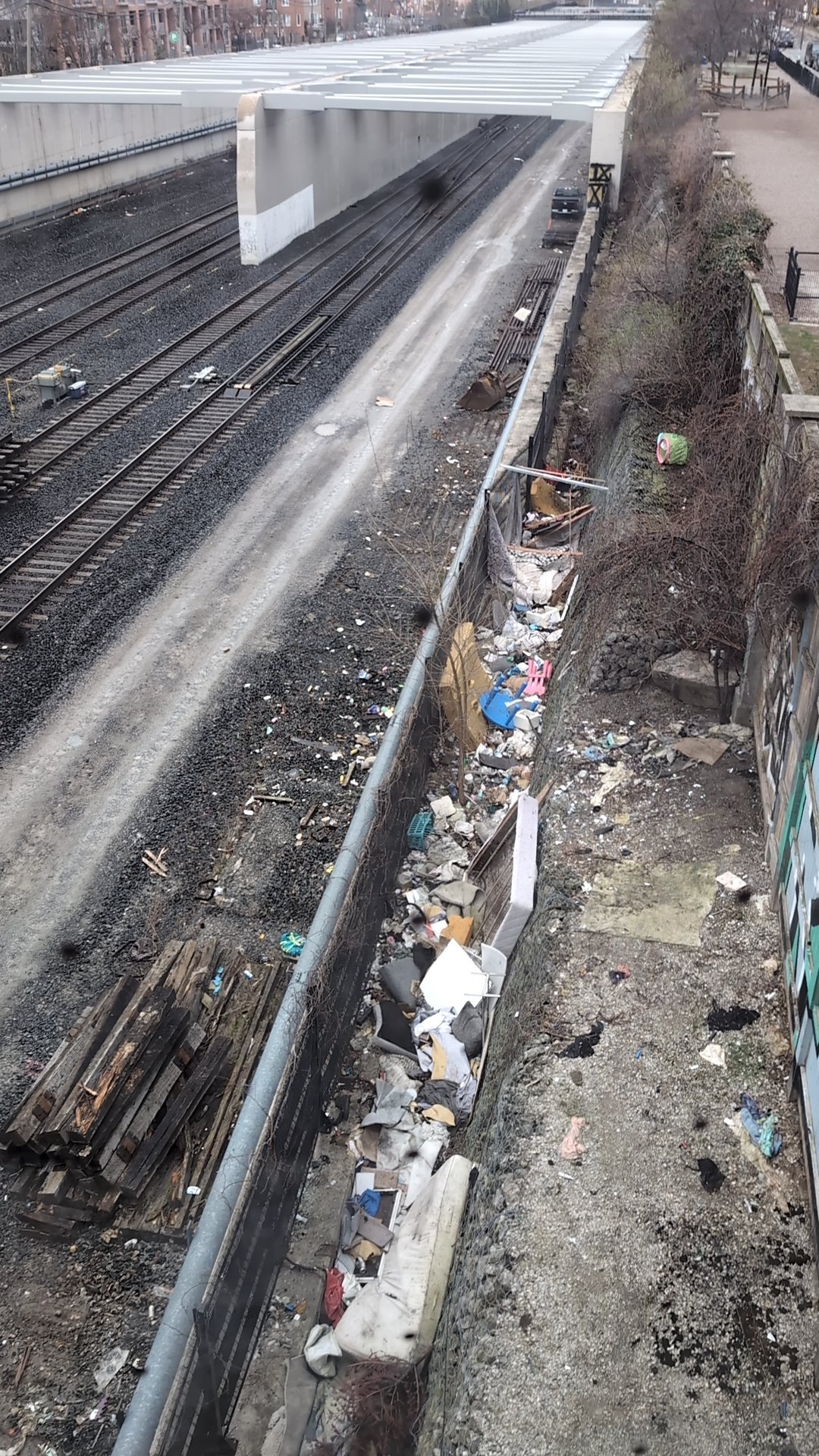 A narrow alley between a concrete retaining wall and brick building adjacent to railroad tracks is filled with extensive illegal dumping, including wooden pallets, household garbage, clothing, a metal shopping cart, white styrofoam, cardboard, and miscellaneous debris stretching the full length of the space. The accumulation creates tripping hazards, blocks drainage, and poses environmental and safety risks near railroad infrastructure and residential buildings. Despite three nearby litter bins with weekly collection, the debris requires immediate removal.