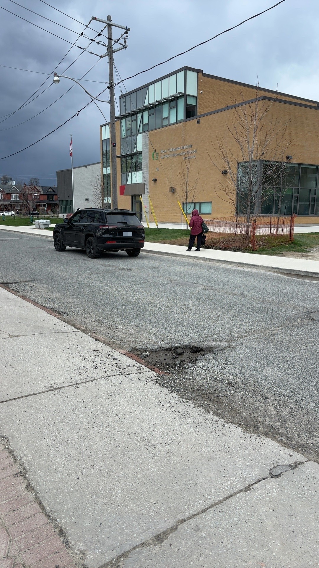 A pothole approximately 2 feet wide and 8 inches deep is present at the edge of the eastbound lane at the street-sidewalk transition, with asphalt broken away and underlying soil exposed. The hole is actively eroding with loose debris around the perimeter, creating a tripping hazard for pedestrians and risk of vehicle undercarriage damage.