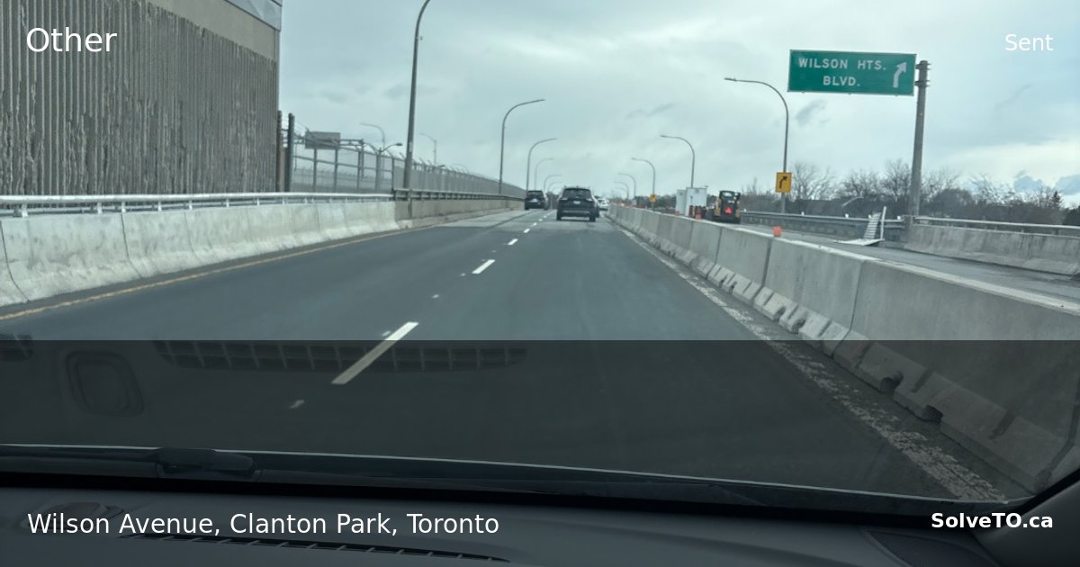 The elevated highway roadway at Wilson Heights Boulevard shows no visible damage, debris, or hazards; street lights are functioning, concrete barriers are intact, and road markings are visible. Multiple vehicles including one dark-colored vehicle are moving normally on the clear asphalt surface. Two active road restrictions are in effect nearby in this area.