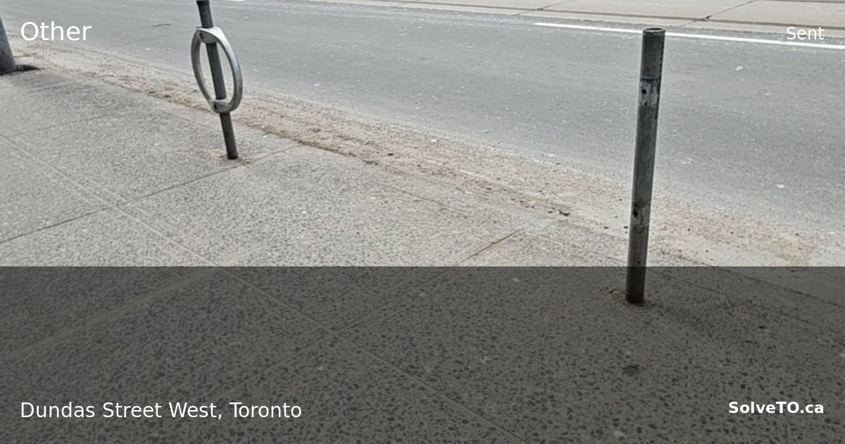 Two metal bollard posts remain at an intersection on Dundas Street West where a bike lock rack or frame structure is missing, likely removed or damaged. The left post has a circular metal ring or anchor loop at its top, while the right is a plain metal pole. This is a minor street maintenance issue with no immediate safety hazard.