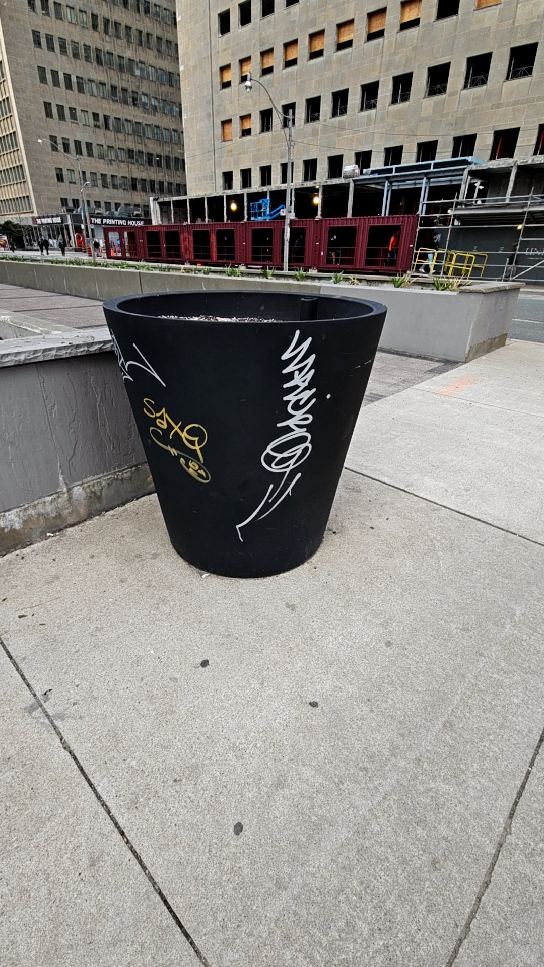 A black cylindrical planter on the public sidewalk at 250 Dundas Street West is covered with graffiti tags, including white line drawings and gold/yellow spray paint marks. The planter remains structurally intact but is visibly vandalized. The area has active road restrictions nearby in the downtown plaza near commercial buildings.
