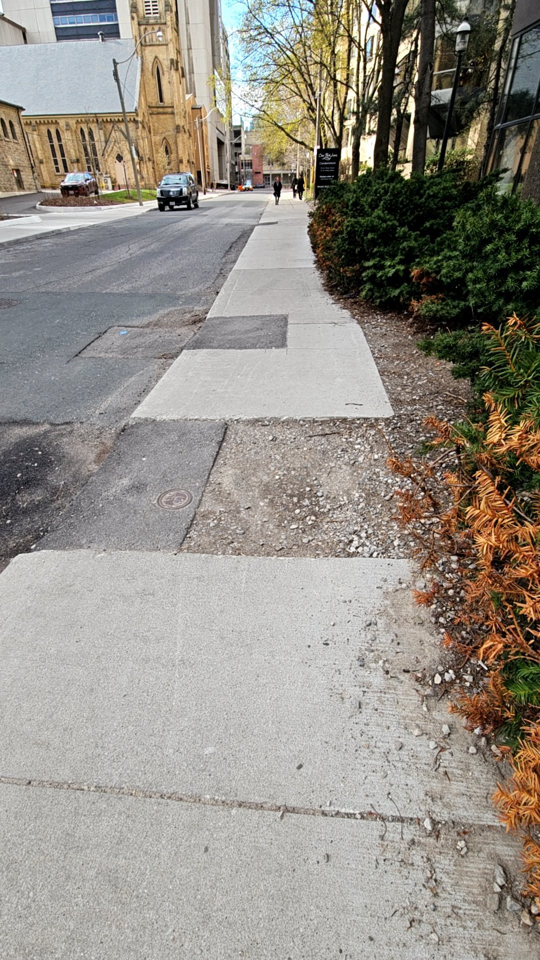 The sidewalk at 292 Dundas Street West has extensive cracked and heaved concrete with multiple uneven sections and raised slabs that create trip hazards. Several areas show visible cracks and deterioration, with only some sections patched in newer grey concrete, posing a clear pedestrian safety risk particularly for mobility-impaired users, elderly pedestrians, and those with visual impairments.