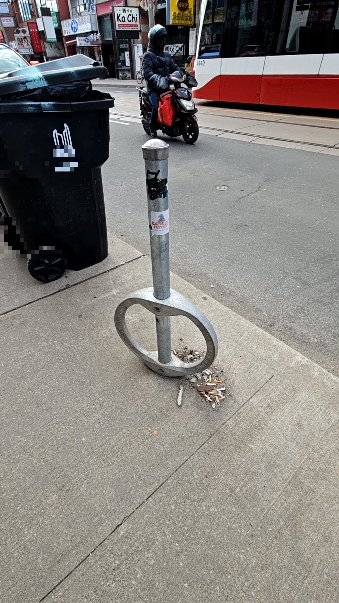 A metal bollard mounted on the sidewalk at 401 Dundas Street West has been knocked down, with its metal ring separated from the concrete base and scattered debris creating a tripping hazard. The loose protective ring poses a risk to pedestrians and eliminates the barrier function the post once provided. The concrete base mounting remains in place, confirming this is fallen infrastructure requiring repair.