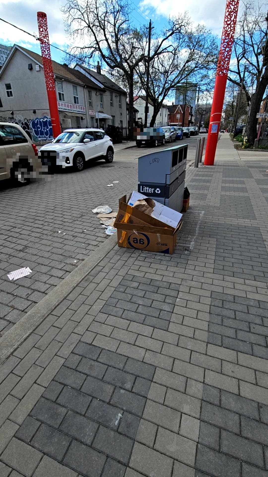 Cardboard box labeled 'a6' with loose papers and packaging debris is scattered on the sidewalk at 79 Huron Street, blocking pedestrian passage. A litter bin is installed nearby in the plaza, indicating the waste should have been properly disposed of. The debris creates an untidy public space and requires removal.