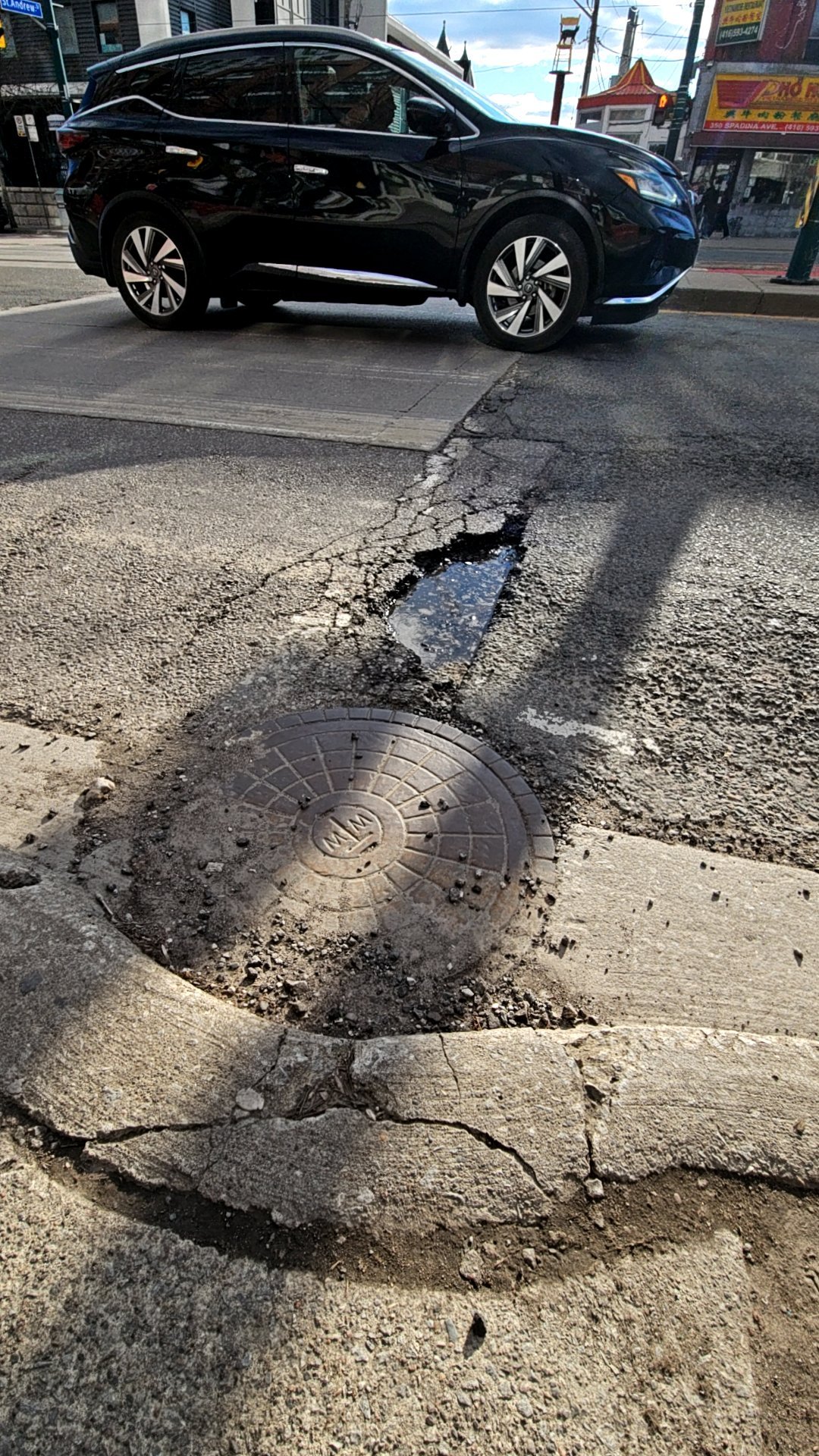 A pothole approximately 1.5 feet wide filled with water has formed in the roadway at 327 Spadina Avenue, with the displaced metal manhole cover sitting beside the hole rather than covering it. The crater shows visible asphalt collapse around the edges with loose debris, creating a tripping hazard and potential vehicle hazard. Surrounding pavement is cracked and deteriorating.