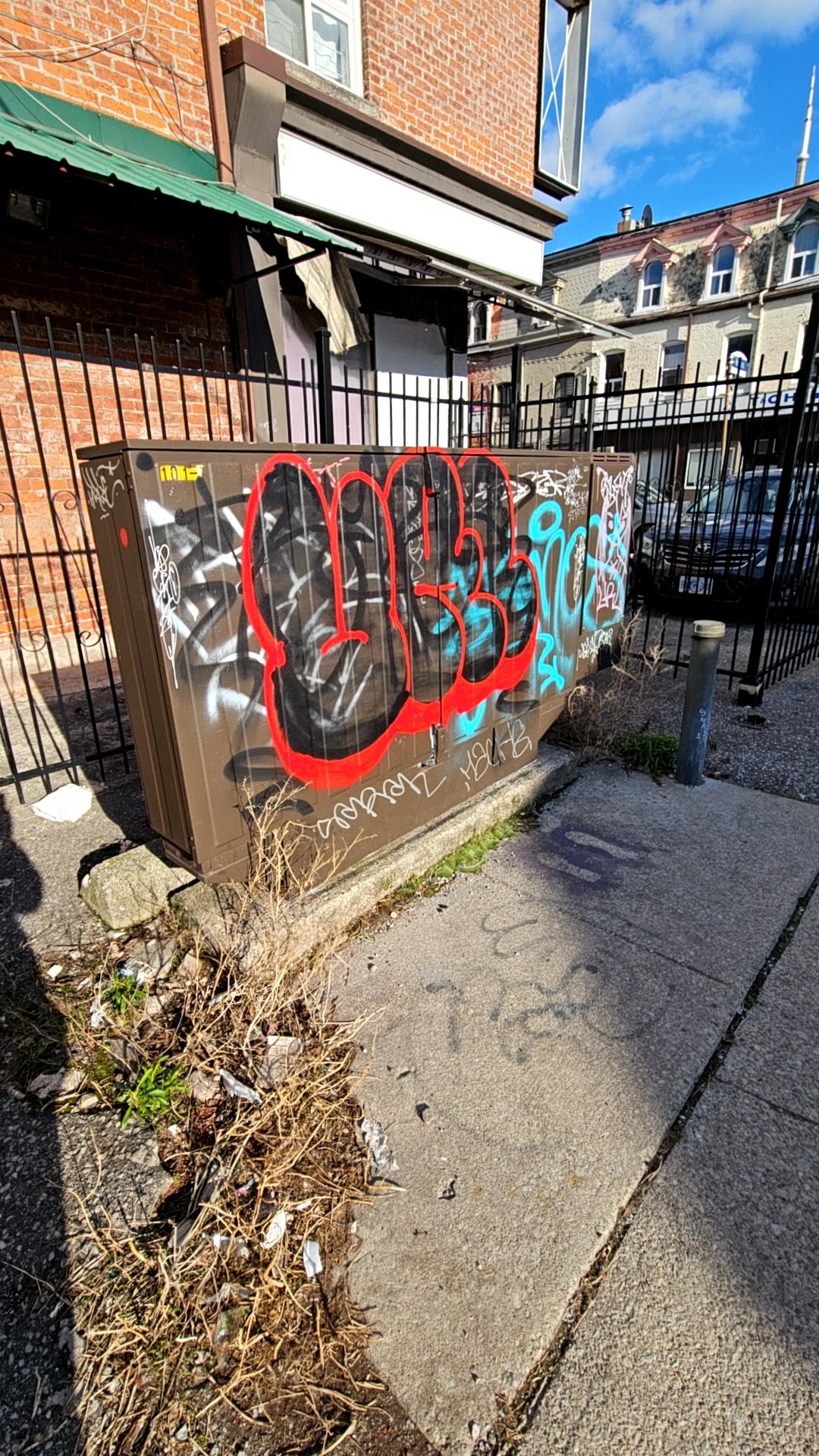 A metal utility box on the residential sidewalk at 49 Huron Street is heavily covered in spray-painted graffiti with red, blue, cyan, and white tags and outlines across its front face and sides. The graffiti obscures warning labels and safety markings on the infrastructure. Dead vegetation and weeds are growing at the base of the box, which is secured behind a metal safety fence.