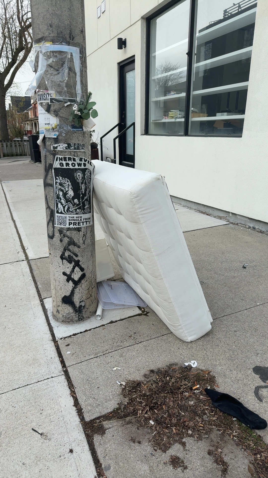 A white mattress in plastic wrapping is abandoned against a concrete utility pole on the sidewalk at 54 Grove Avenue, blocking pedestrian passage. The site is in front of a residential building with no indication of occupancy. Three litter bins with regular collection service are located nearby.