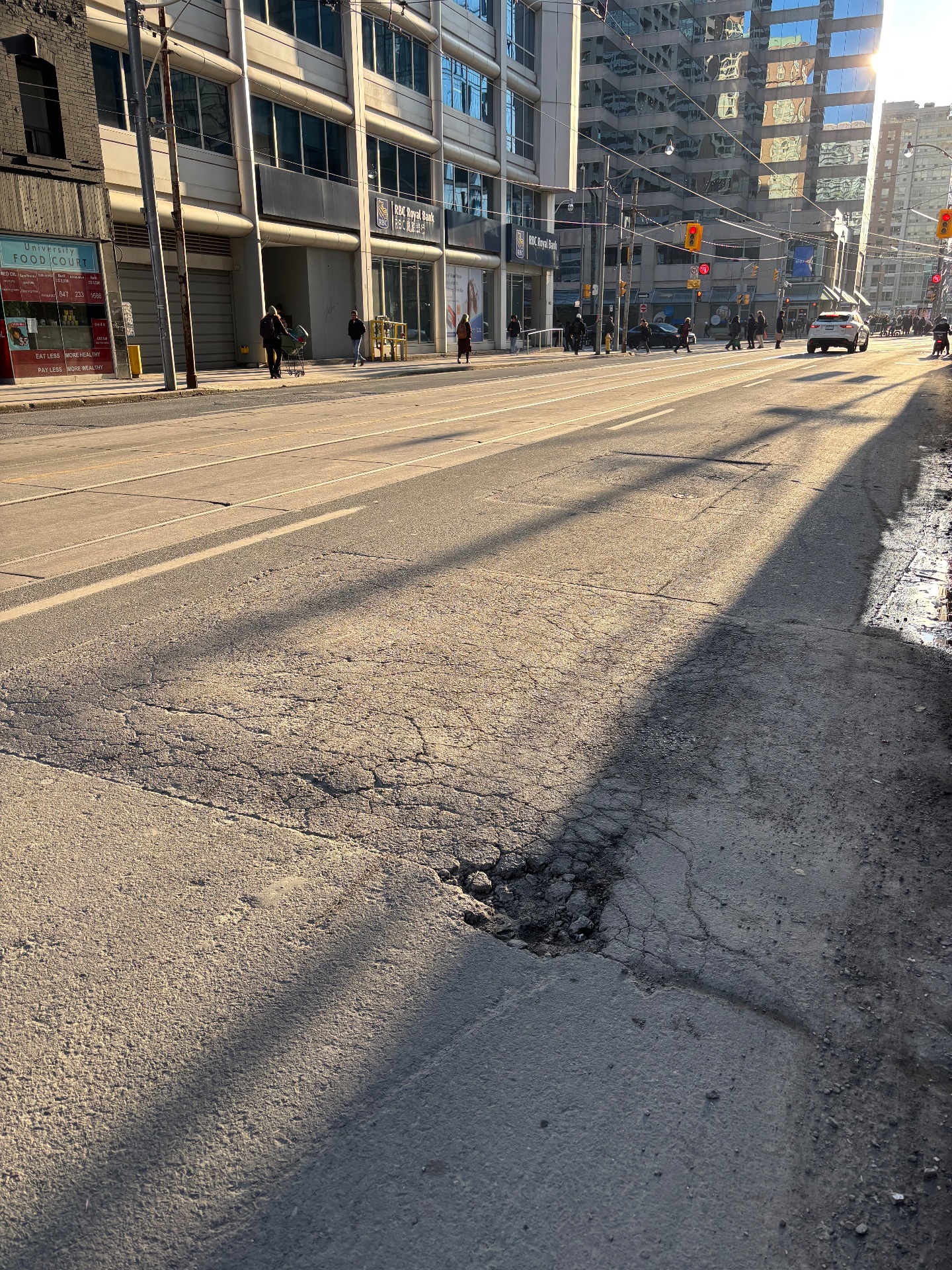 The asphalt at this downtown intersection shows significant surface deterioration with multiple cracks and a notable depression that creates hazards for pedestrians, cyclists, and vehicles. The damage is located in a high-traffic area near streetcar tracks and spans a considerable area, requiring prompt repair to prevent safety incidents.
