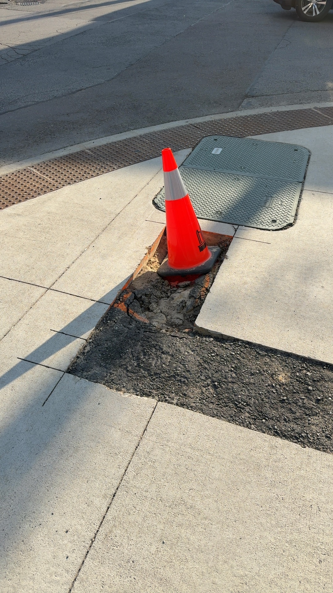 An active excavation pit on the public sidewalk is exposing soil and utility infrastructure with only a red traffic cone and metal utility cover marking the work area. The open pit creates a trip hazard and blocks pedestrian passage, with no apparent safety fencing beyond the single cone, leaving pedestrians vulnerable to stepping into the excavation or tripping on cover edges. This appears related to a collapsed utility cut in the area.
