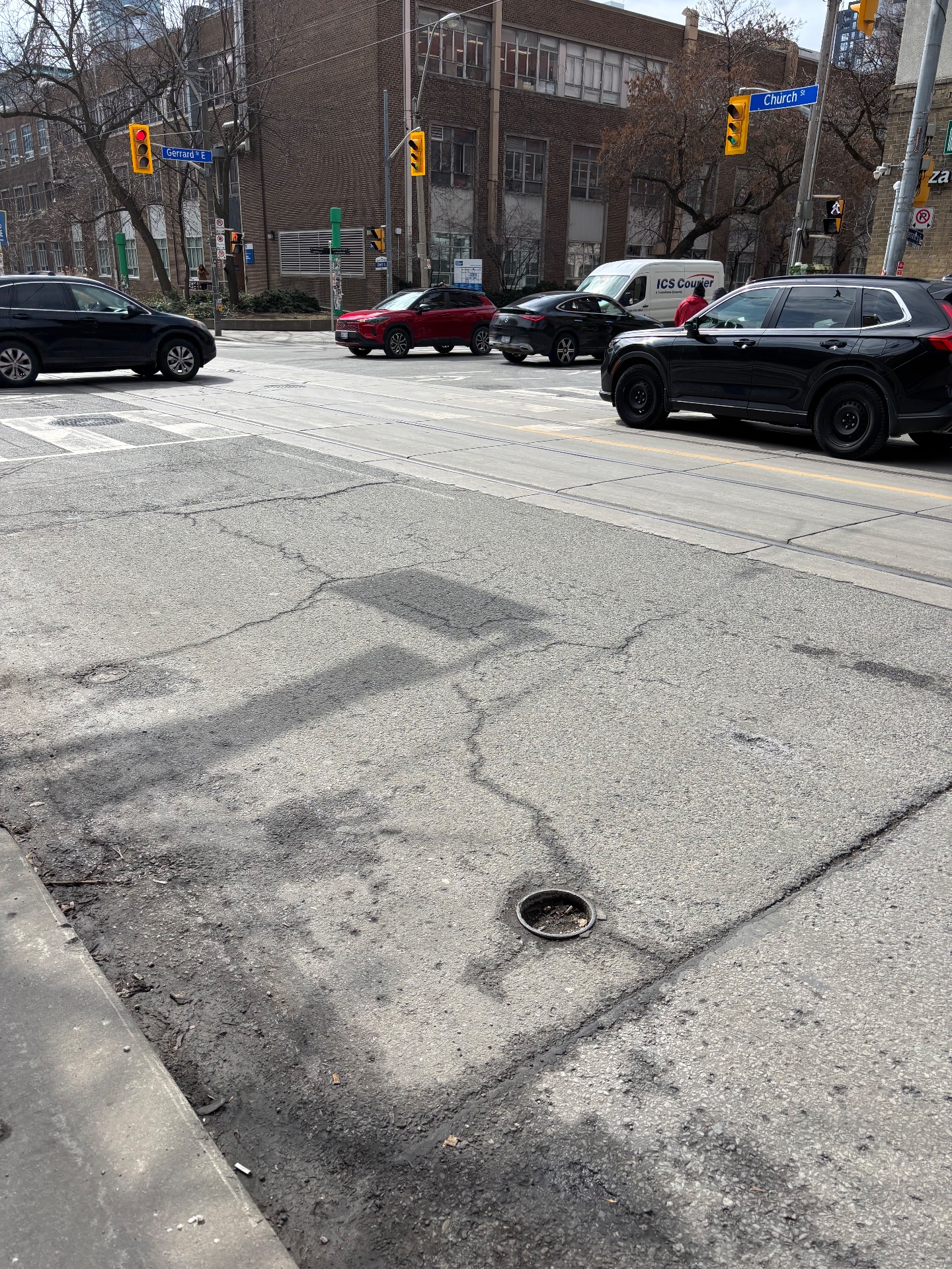 The northbound curb lane just north of Gerrard Street shows extensive asphalt damage with large cracks, missing sections, and uneven surfaces creating hazards for vehicles and pedestrians. The deterioration appears structural and risks further damage and accidents if left unaddressed.