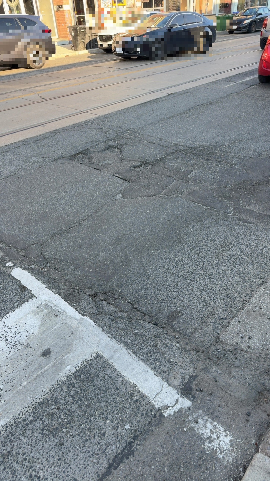 Dupont Street shows multiple cracks and tar patches across the road surface with uneven wear patterns, indicating asphalt deterioration that poses a tripping and vehicle hazard. The pavement is compromised in multiple locations along this public street parking and travel area.