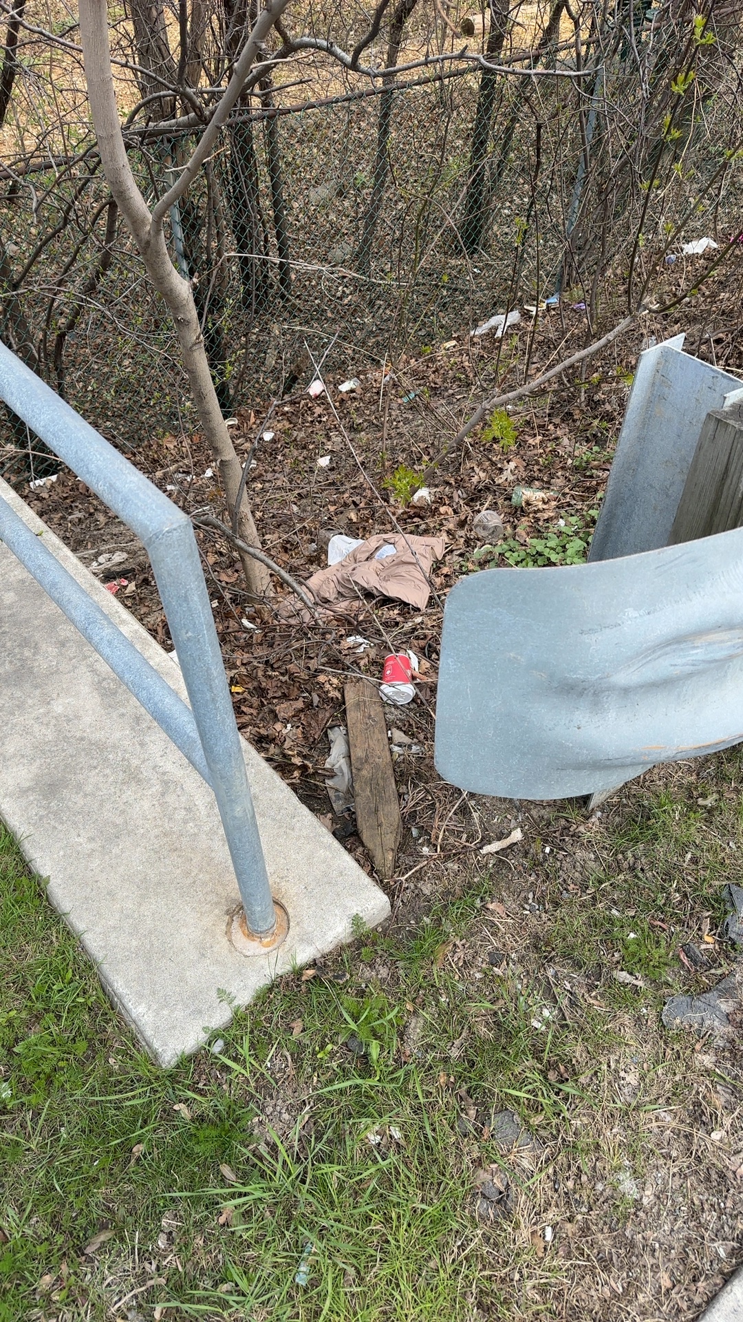 Concrete pipes, metal culvert sections, wooden posts, and debris are scattered in a wooded ravine behind a chain-link fence on Sheppard Avenue East. A tan cloth/tarp lies among the leaf litter and branches, presenting a tripping hazard and environmental concern in this naturalized area. The abandoned construction or utility materials appear to be illegally dumped.