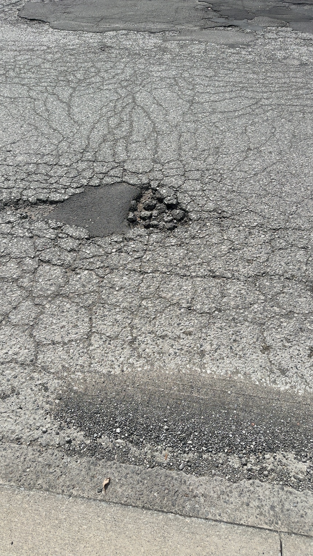 A pothole approximately 12-18 inches in diameter with exposed debris and missing asphalt is visible at 129 McMahon Drive, creating a hazard for pedestrians, cyclists, and vehicles. The surrounding pavement shows extensive alligator cracking and deterioration across a large section, indicating advanced pavement failure. Five catch basins in the area average 23 years old.