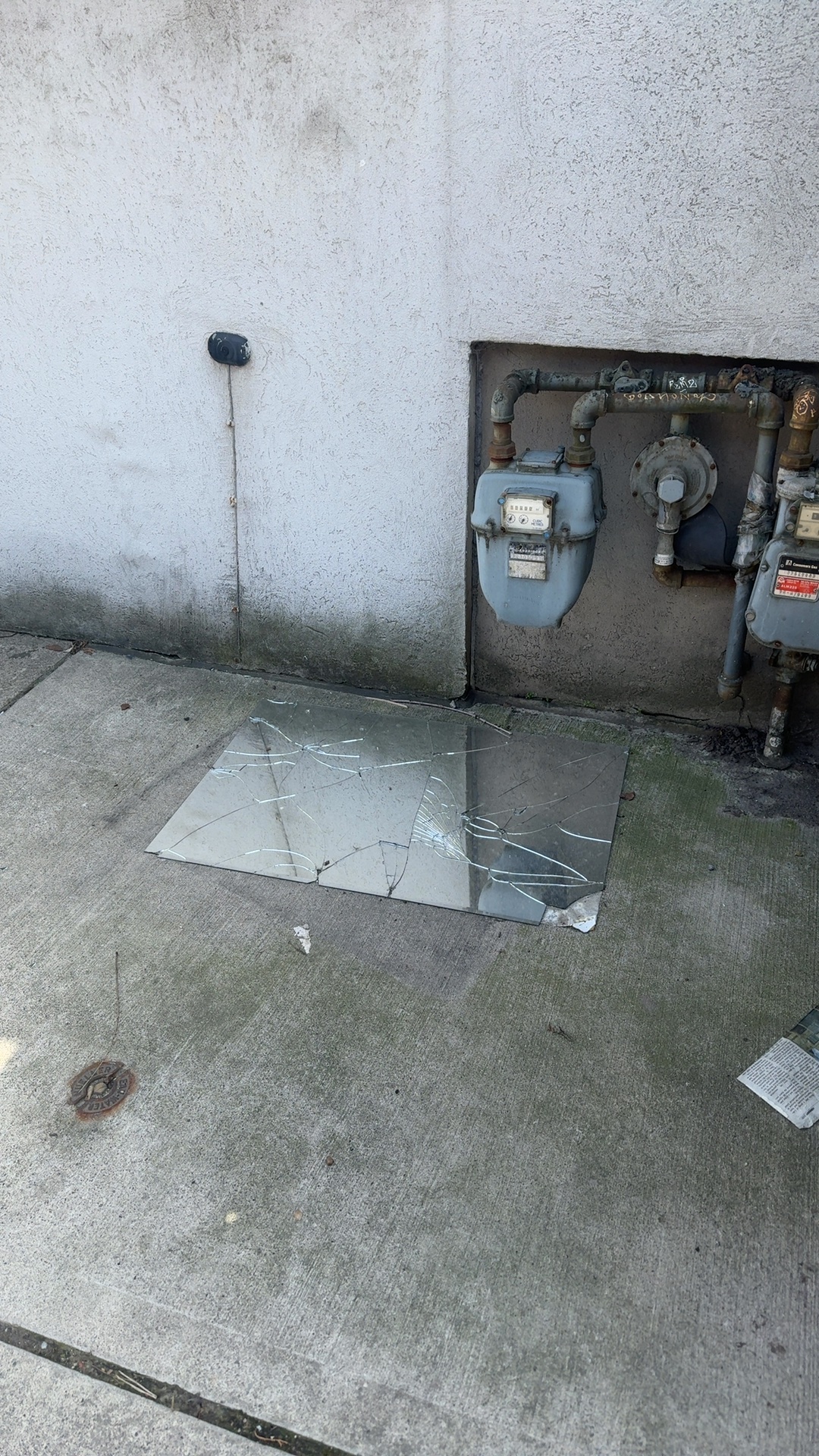 A broken glass panel with shattered edges and sharp fragments lies on the sidewalk at 488 King Street East, adjacent to a gas meter and exposed pipes on the wall. The damaged protective cover creates a tripping and laceration hazard for pedestrians passing the utility enclosure.