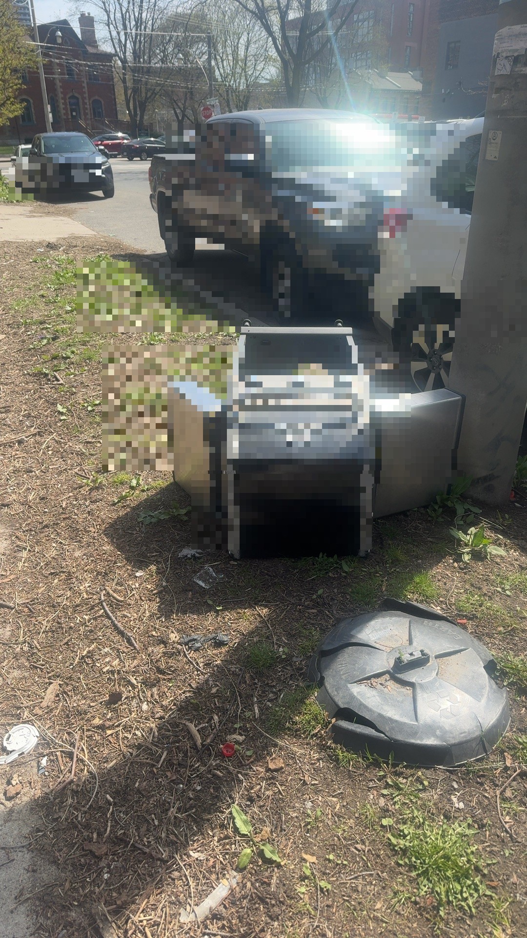 An abandoned barbecue grill and metal dome cover are discarded on a grass strip beside the sidewalk on Power Street in Moss Park. Both items are deteriorated with visible sharp edges and control hardware, creating trip hazards and obstructing public space. Litter collection occurs 5 times per week in this residential area.